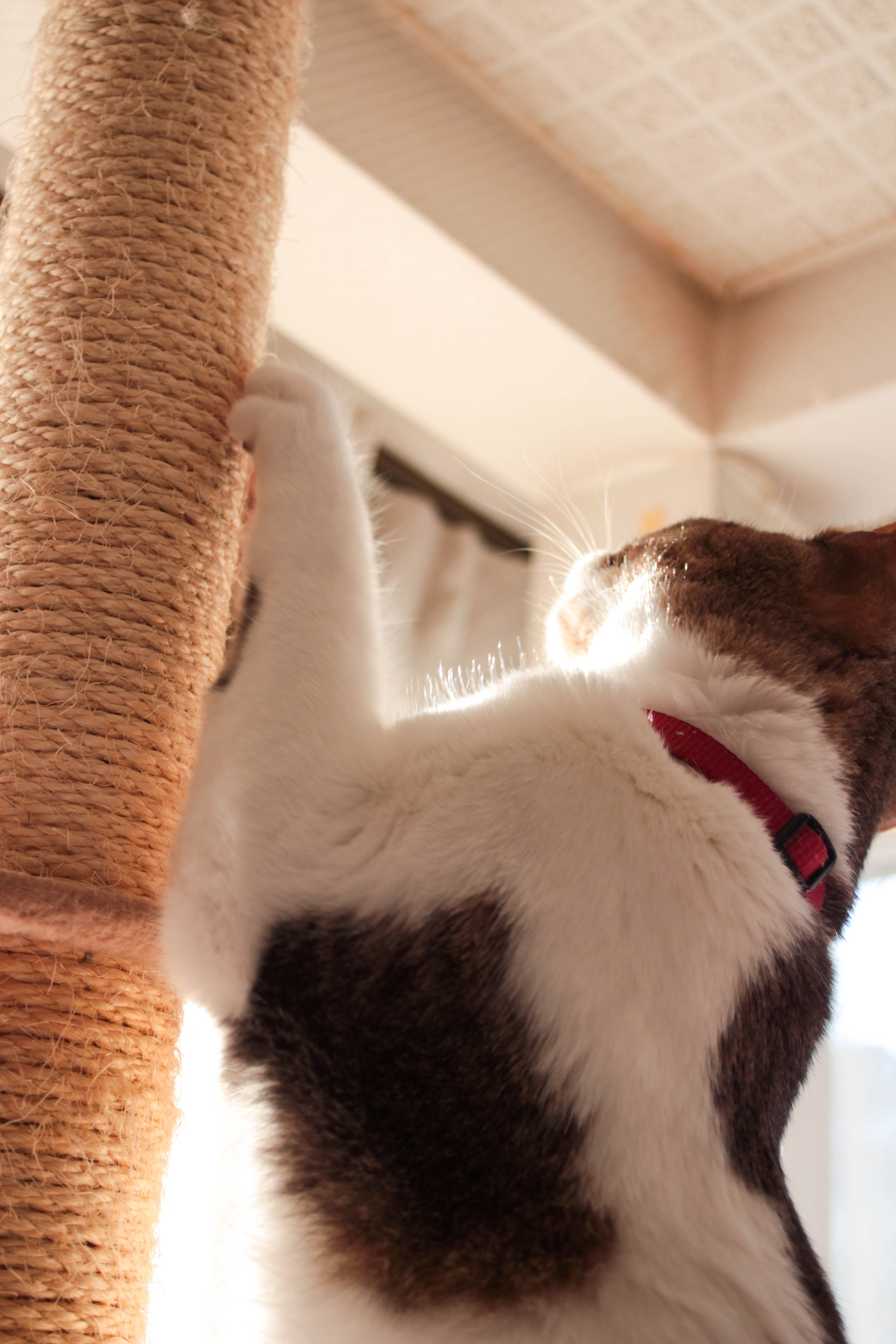 猫は硬くて安定感があるもので爪とぎをする。爪とぎ用のものがないと柱や壁をボロボロにしてしまう。一つでも気に入った爪とぎができる場所があれば自然とそこしか使わなくなるようです。