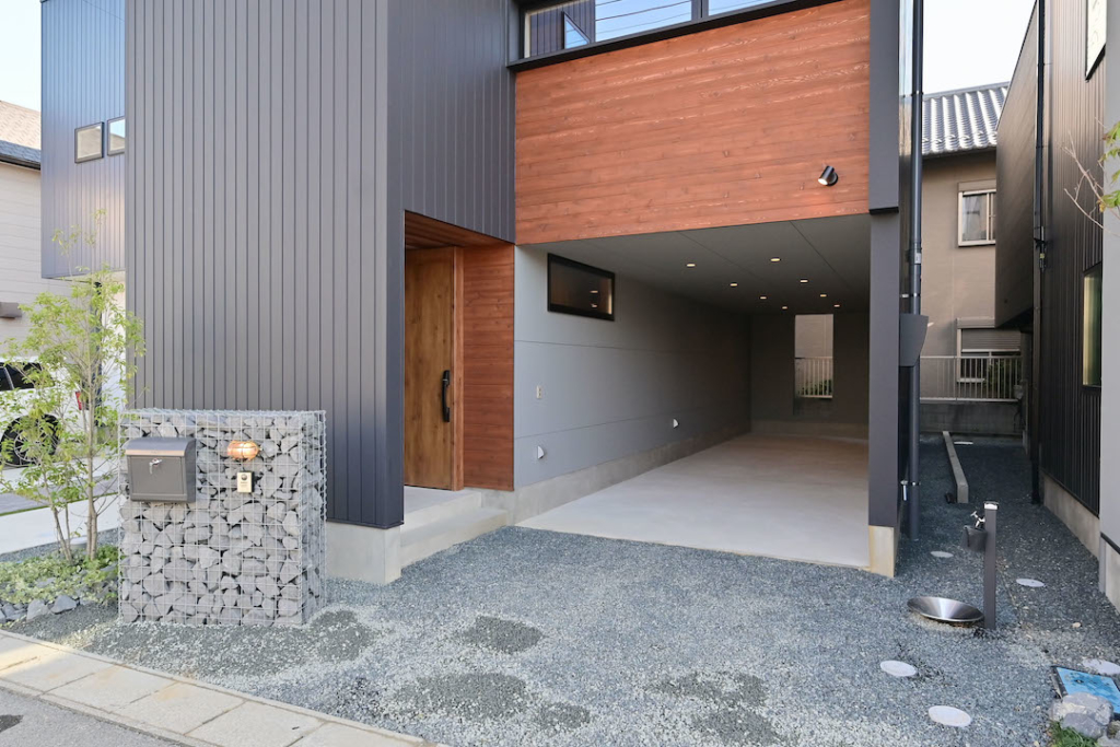 外壁には、黒のガルバリウム鋼板と天然木のレッドシダー
