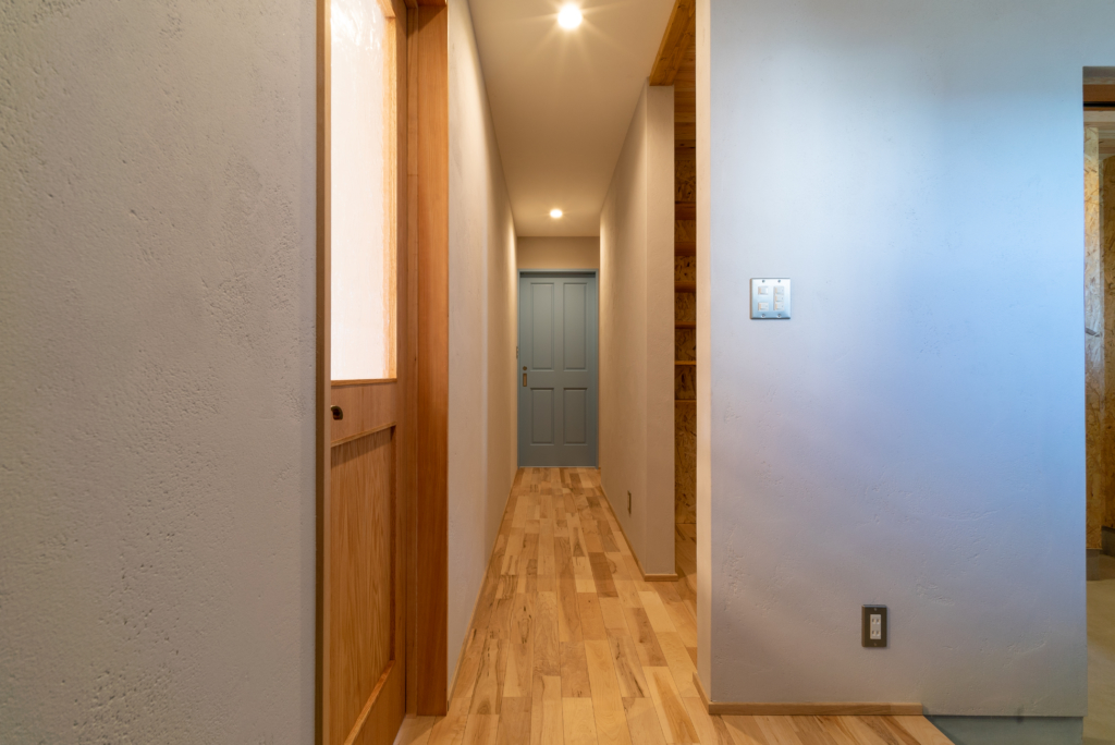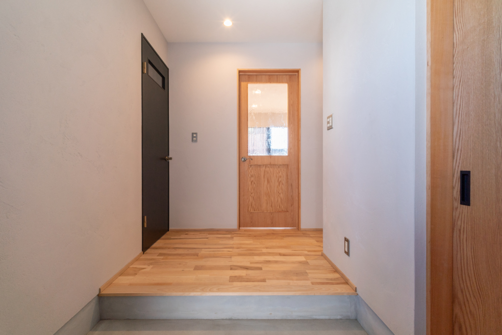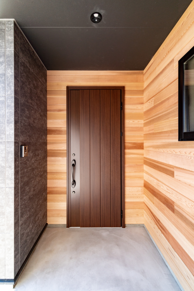 玄関の天井には杉板、壁にはOSB合板