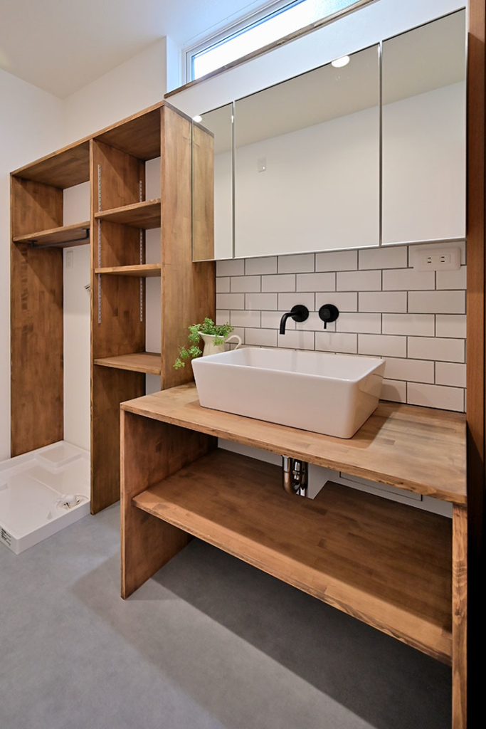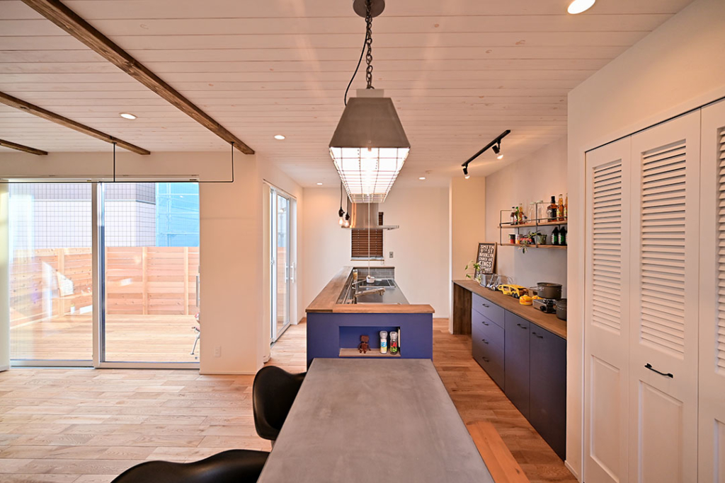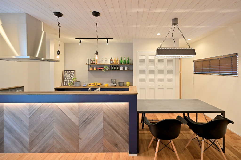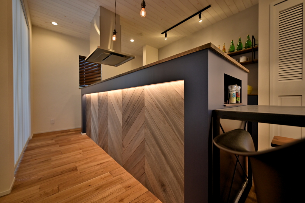 キッチンの腰壁には、ヘリンボーン貼りした無垢材