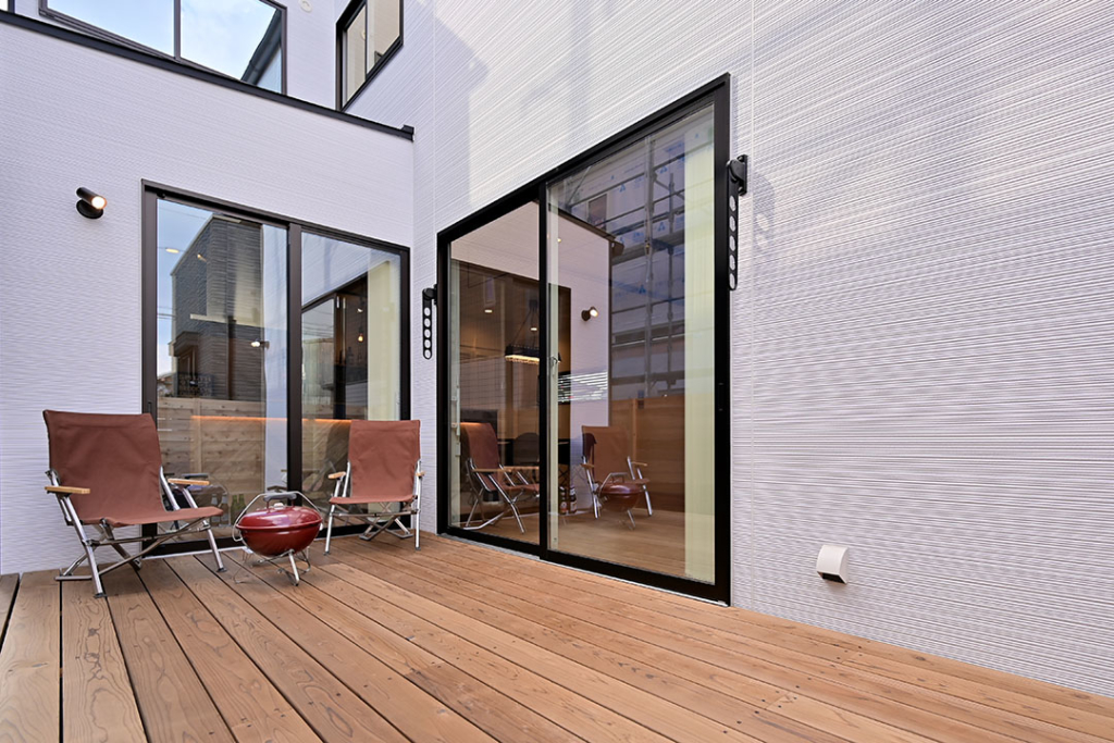 大人数でのBBQを楽しめる広々としたウッドデッキ