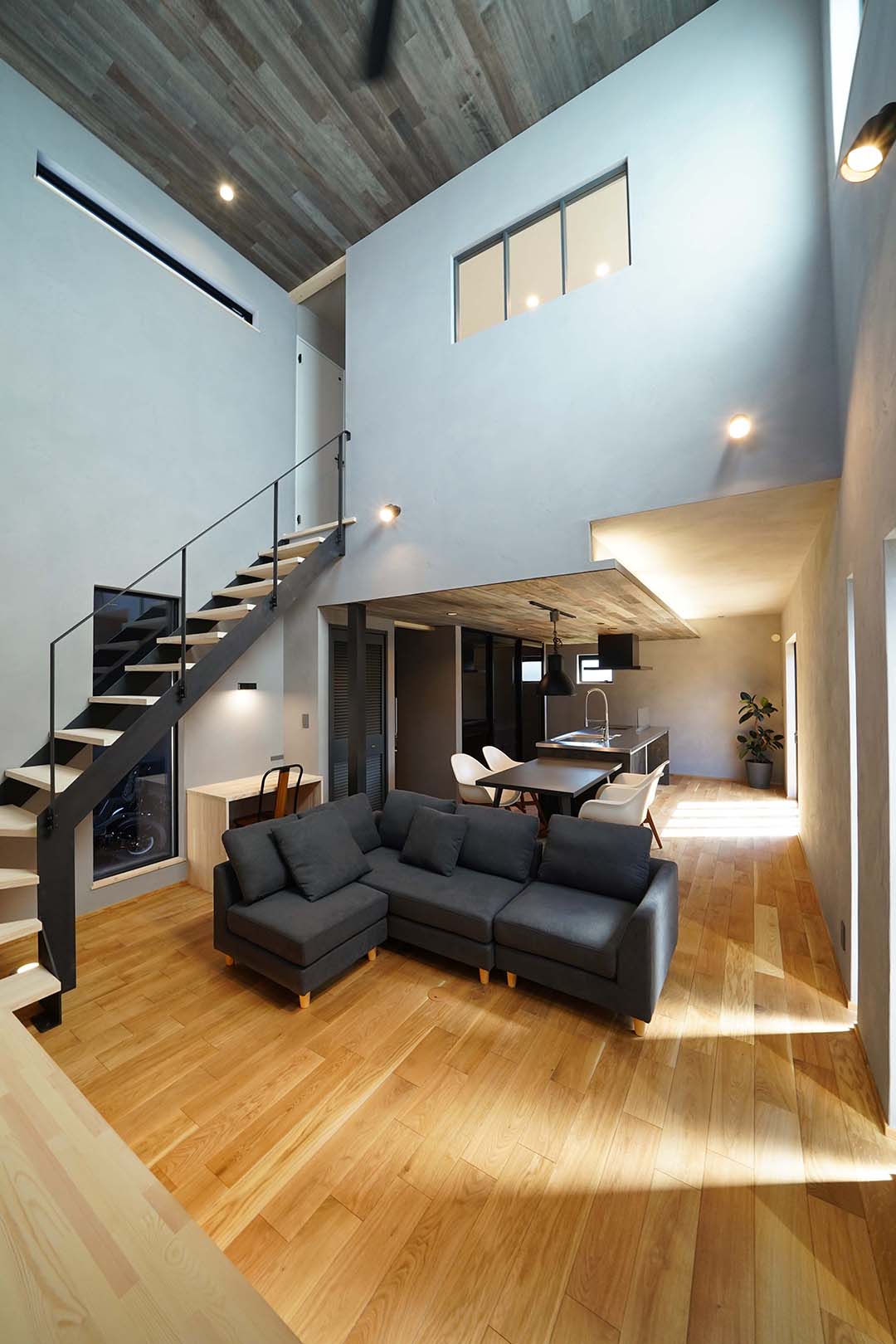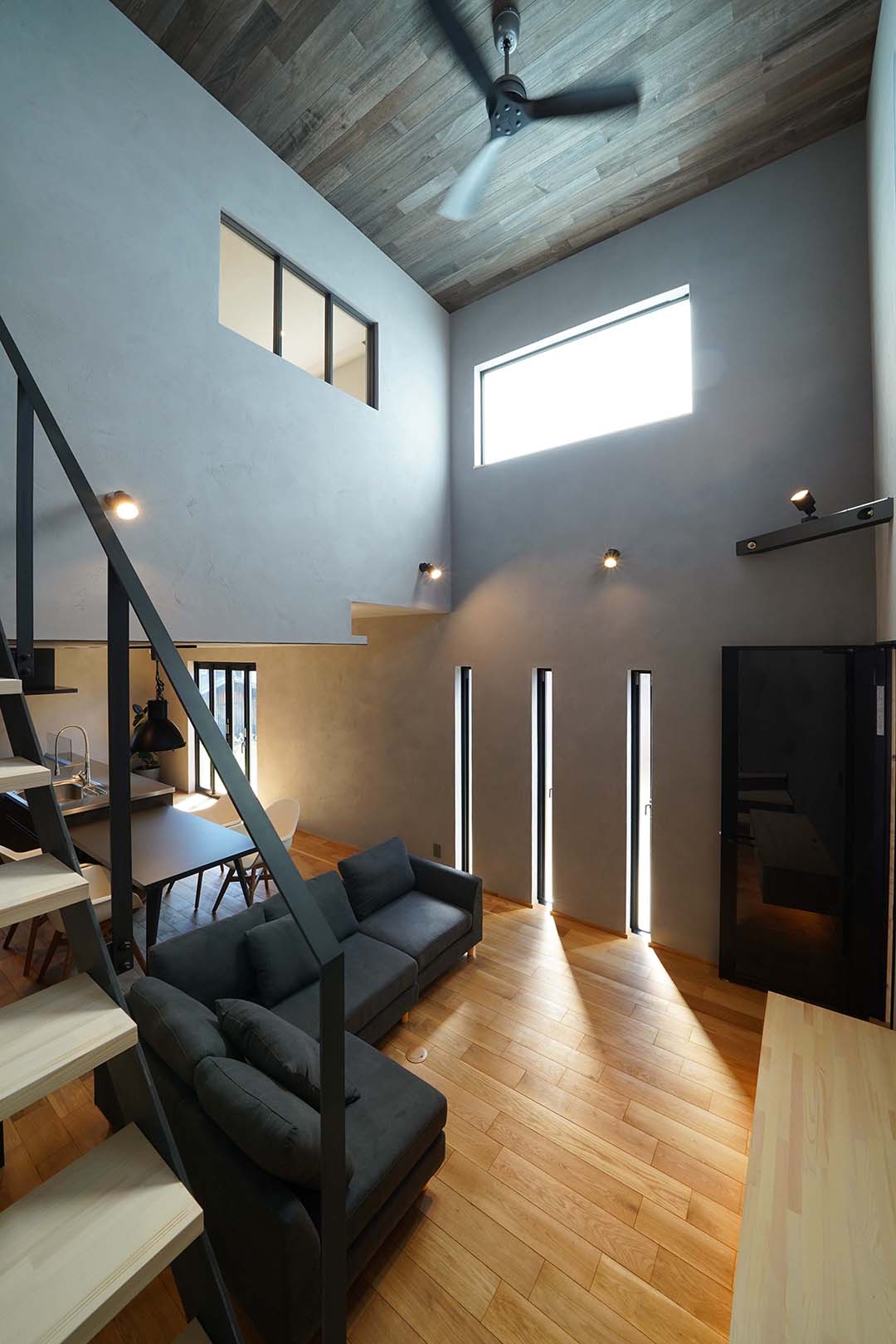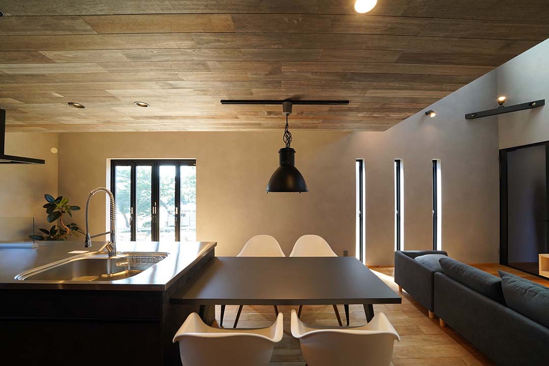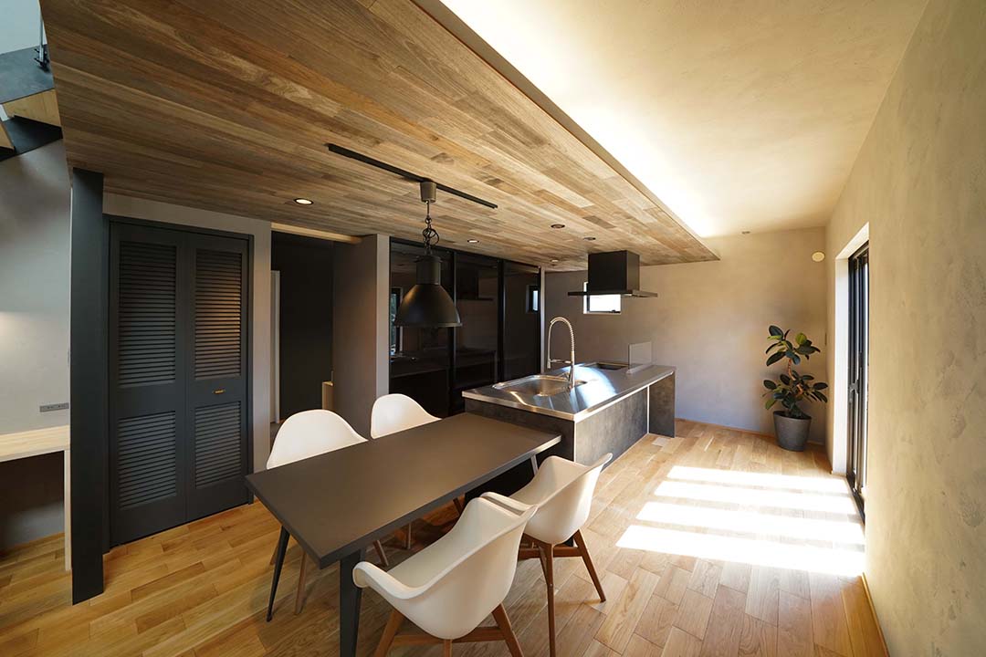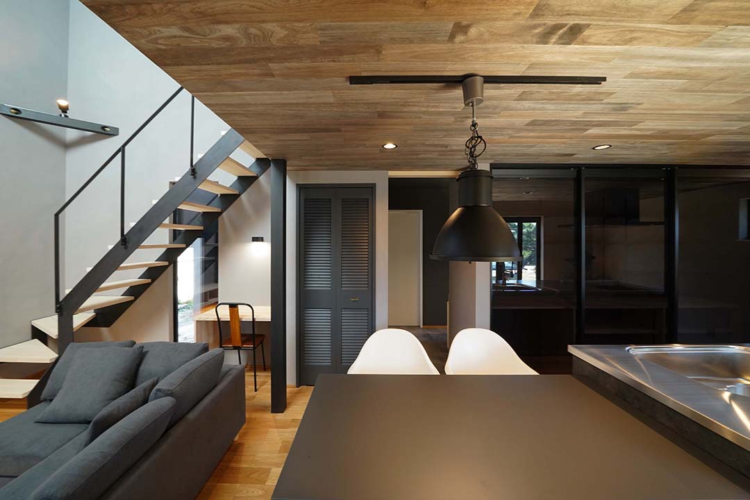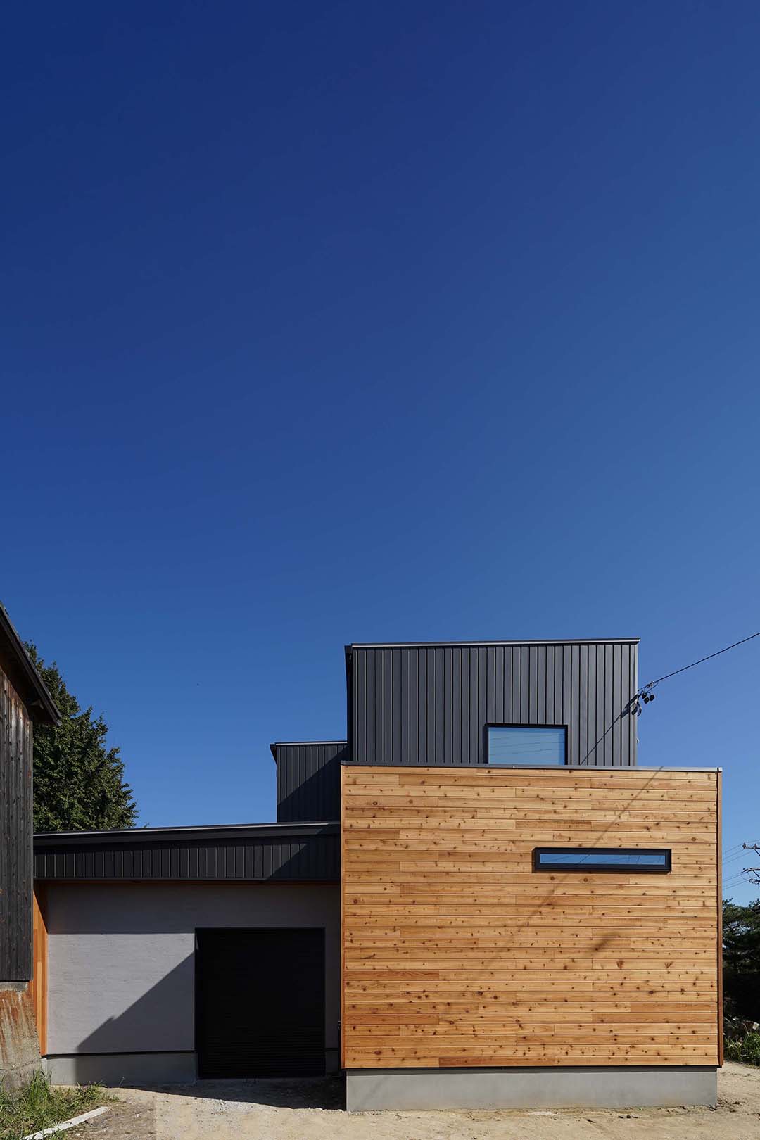 黒のガルバリウム鋼板とレッドシダーと漆喰を使用した外観