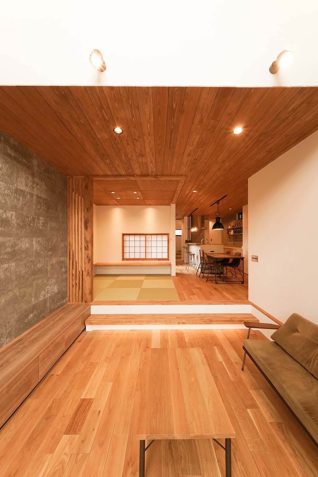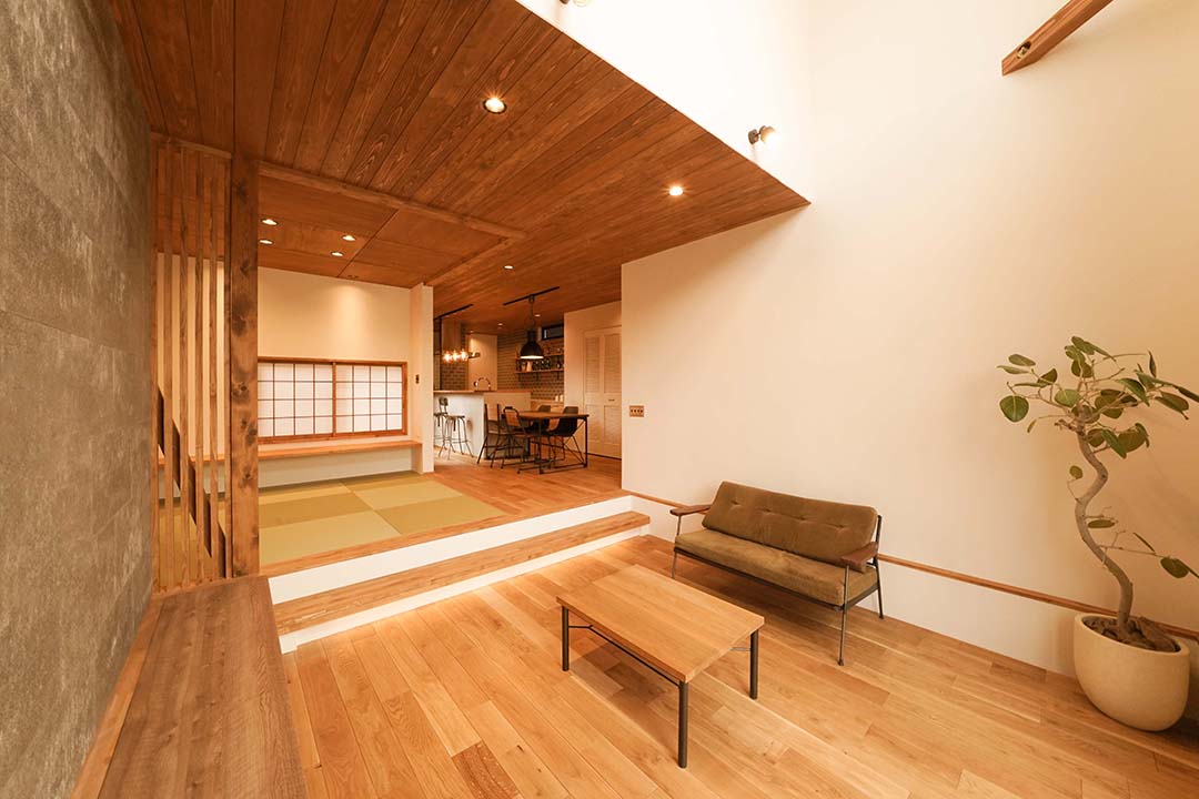 ダウンリビングにして、空間に変化を付けています。畳コーナーの障子を開けると、中庭を望むことができます。