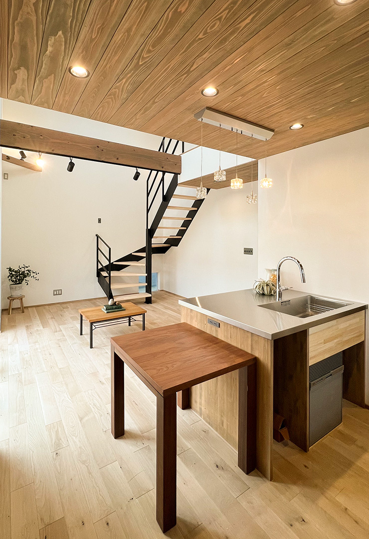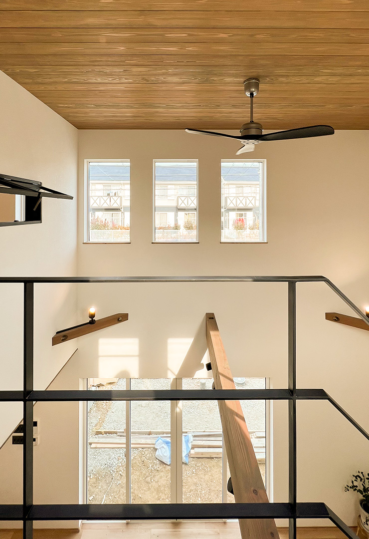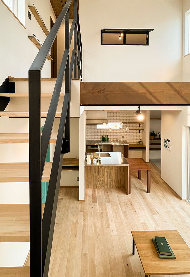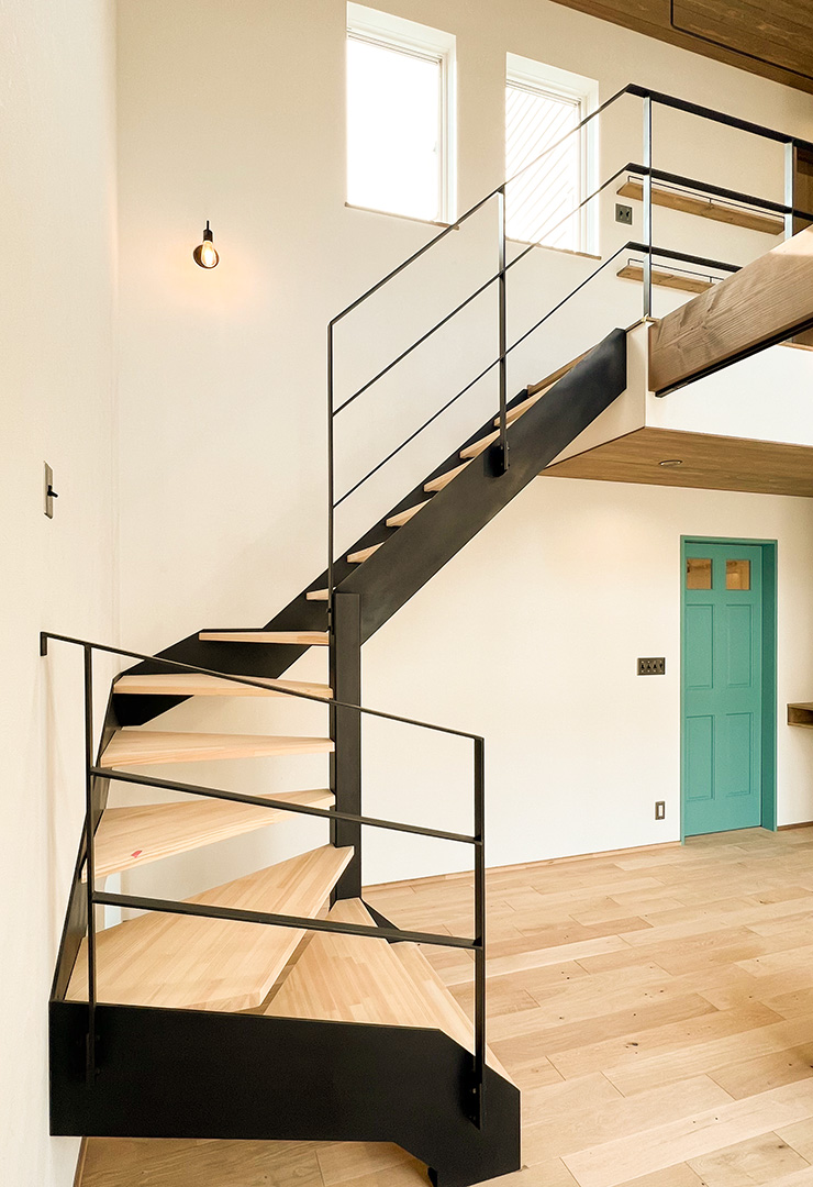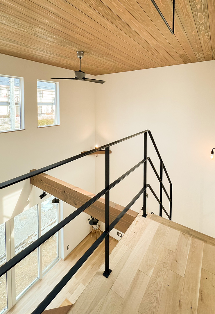 大きな吹き抜けには、アイアンの階段