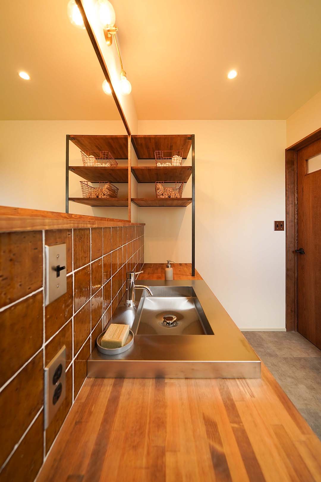 造作の洗面化粧台。奥には、オープンの棚を設けました。