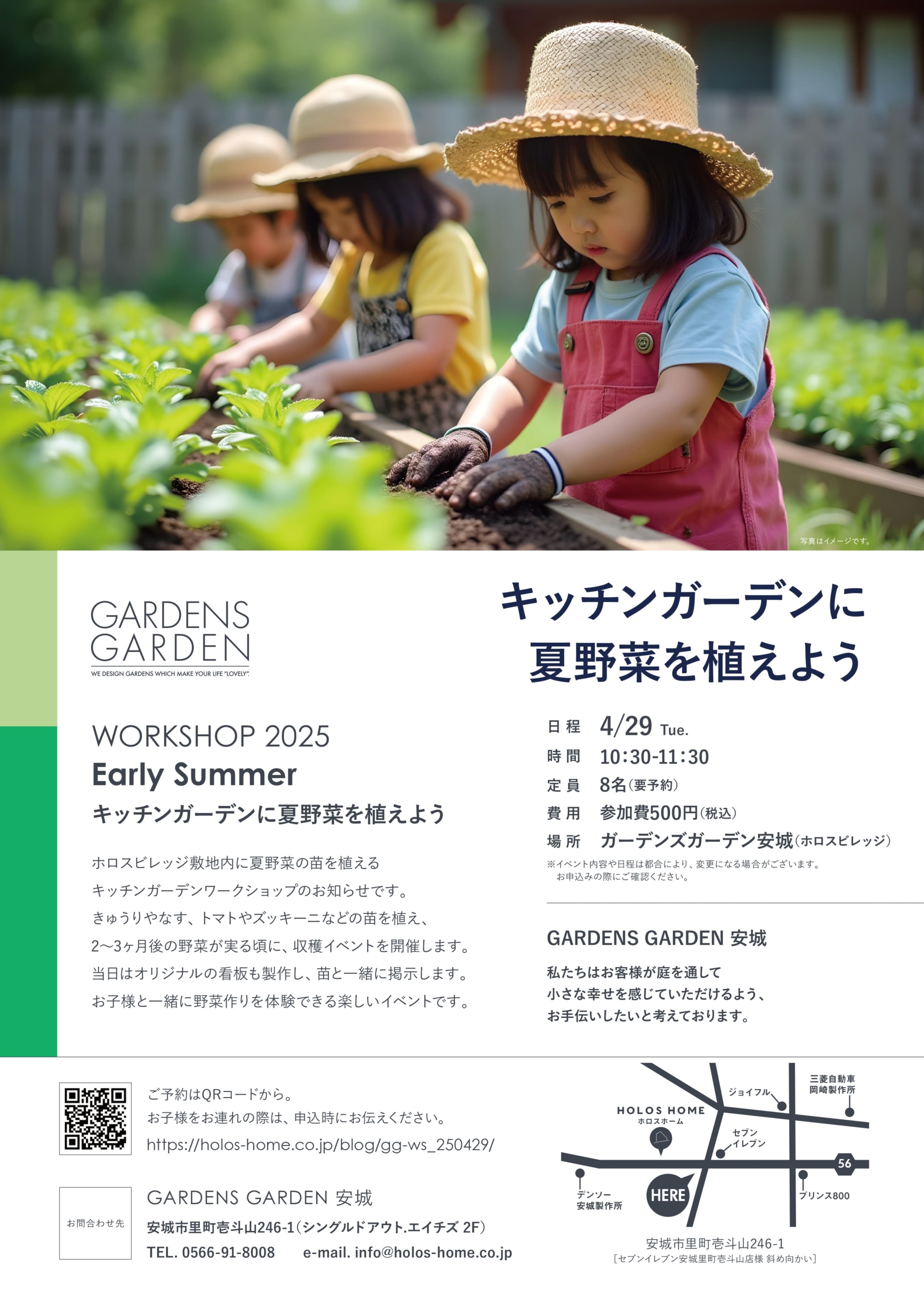 ガーデンズガーデン安城(ホロスビレッジ)敷地内に夏野菜の苗を植えるキッチンガーデンワークショップのお知らせです。
