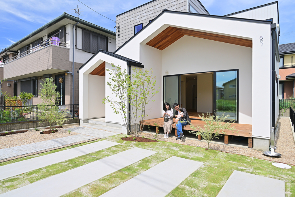 白を基調としたシンプルな色味と、可愛らしい三角屋根のカバードポーチが印象的な外観。