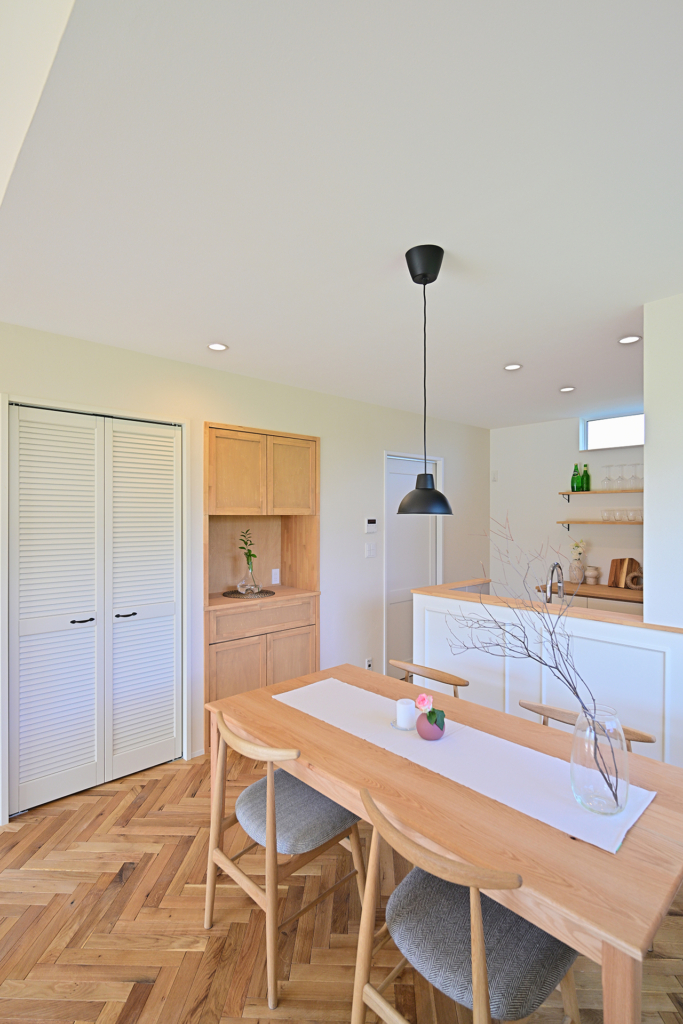 ヘリンボーン柄に組み合わせたリビング・ダイニングスペースの床には、柔らかく温かな印象の無垢材を使用。