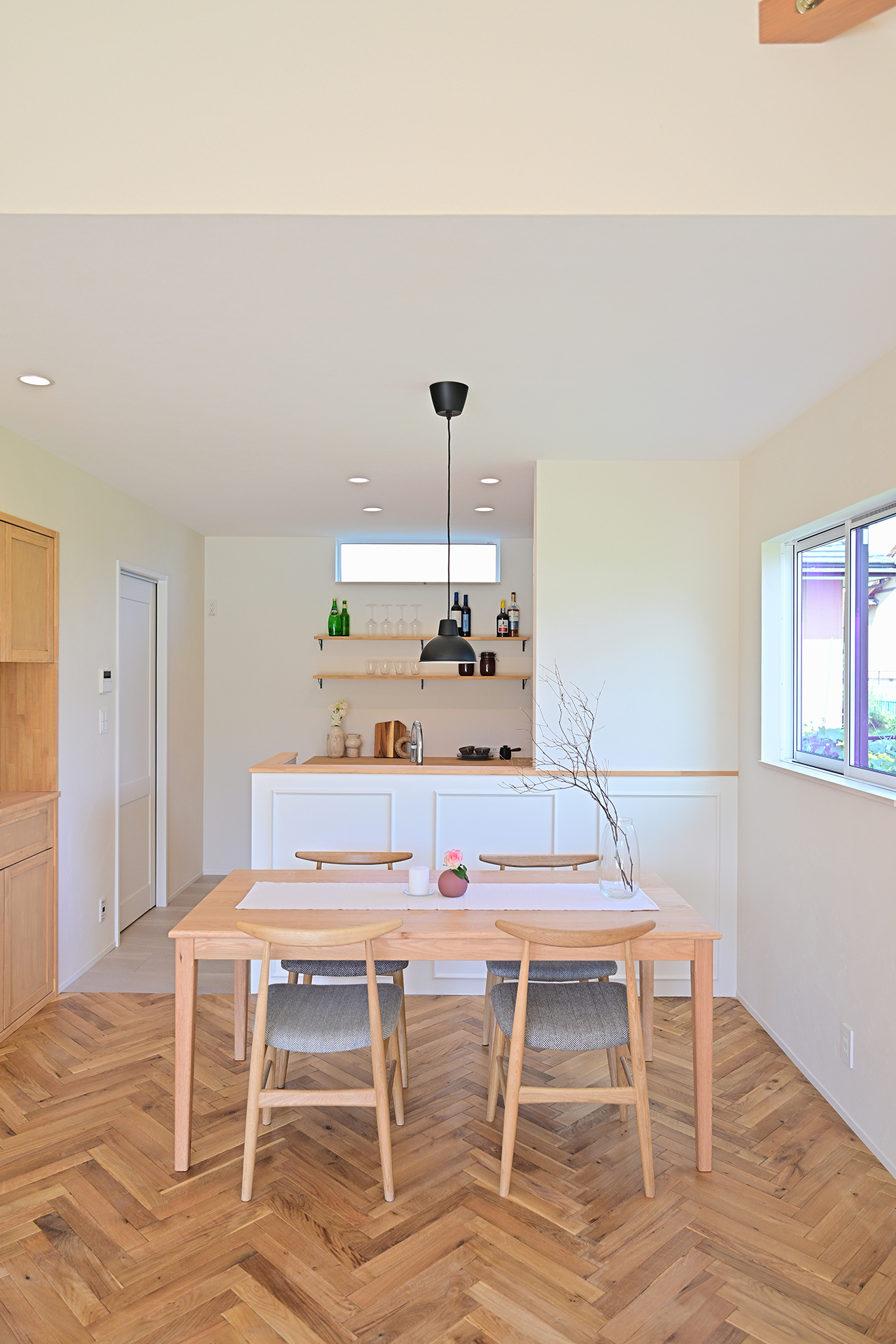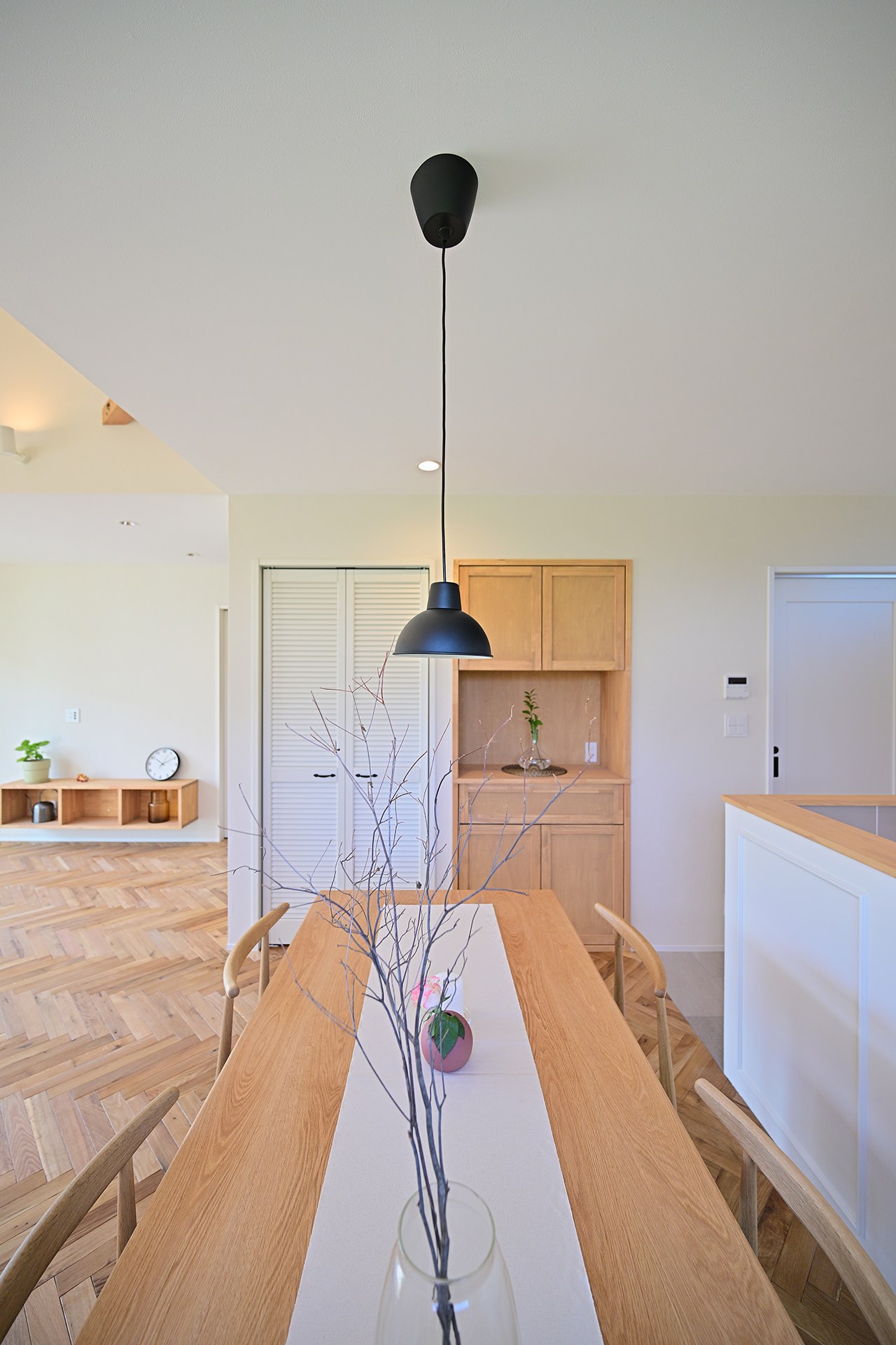 ヘリンボーン柄に組み合わせたリビング・ダイニングスペースの床には、柔らかく温かな印象の無垢材を使用。