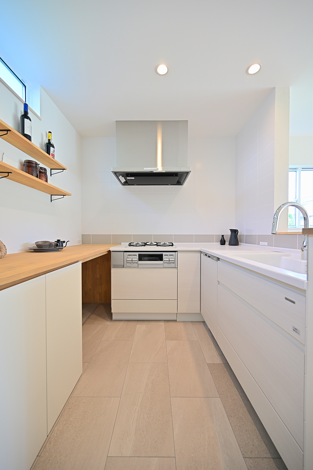 コンロの位置をL字に配置したキッチンスペース。