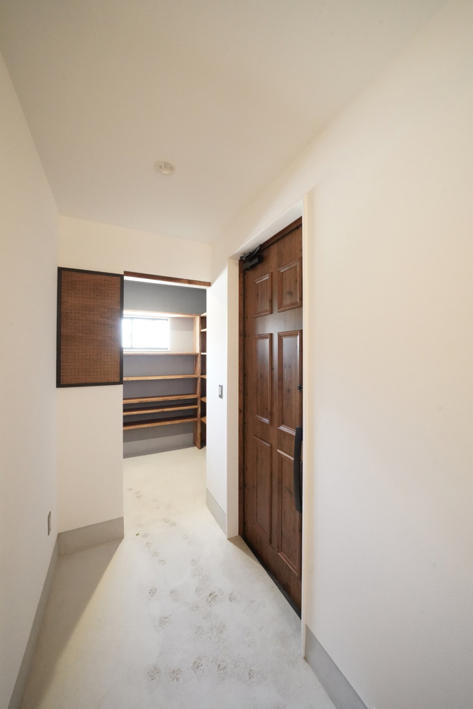 シューズクロークの壁と天井はお施主さんのDIYでパーシモンEウォールのアッシュグレーを使用。