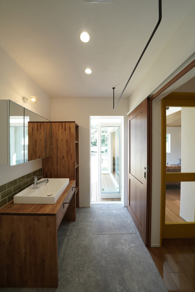 洗面スペースはサンワカンパニーの三面鏡、