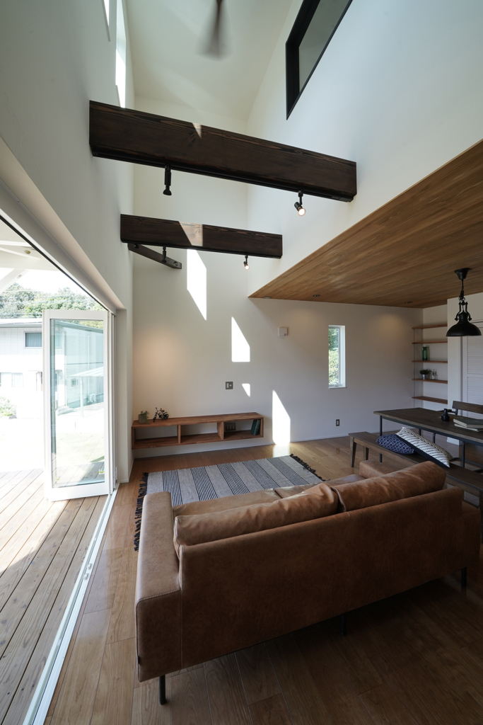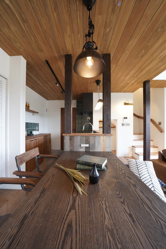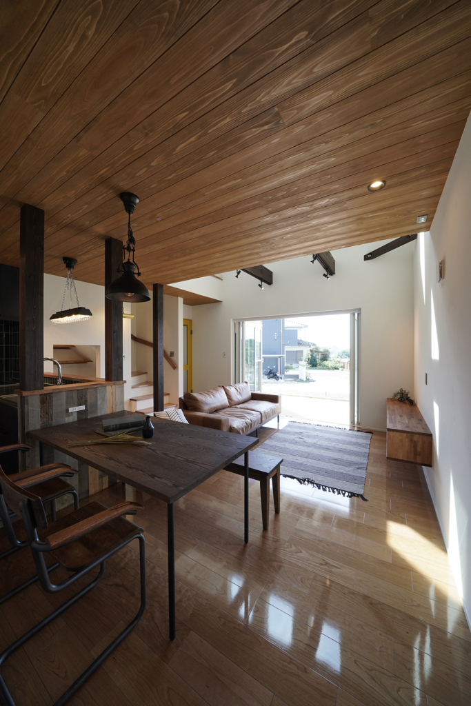 天井は針葉樹合板と梁表で木の部分を見せることで海外風の雰囲気に。