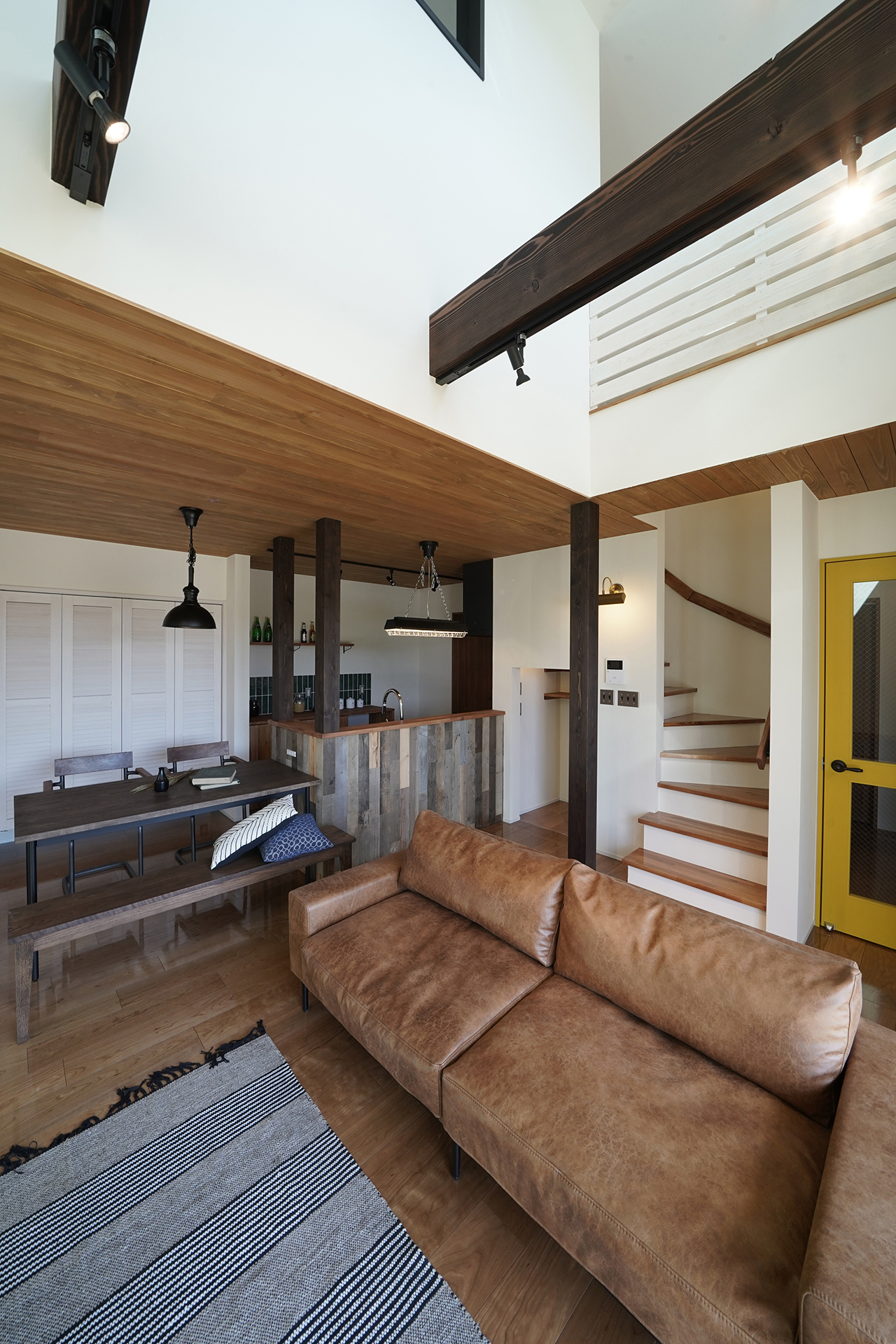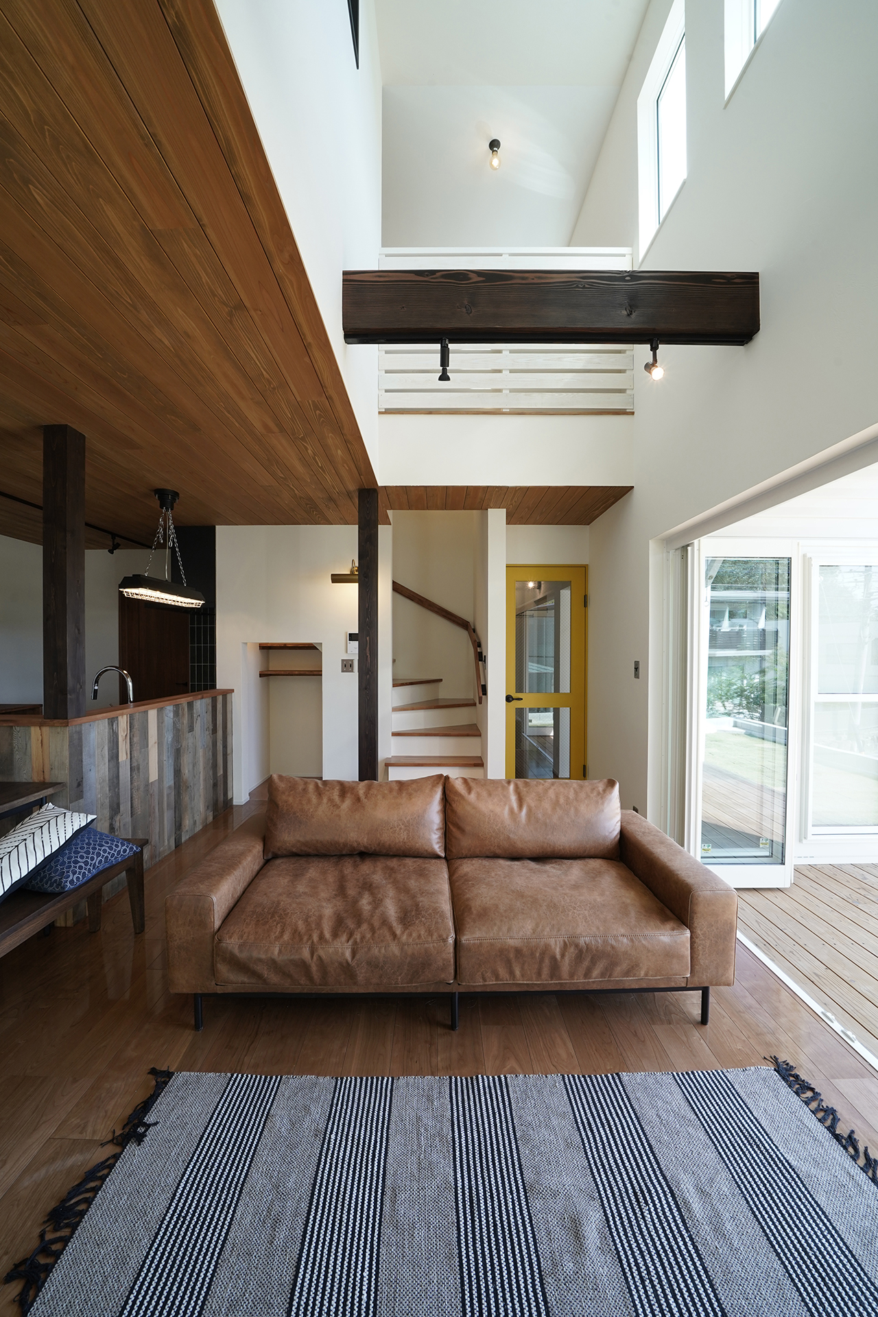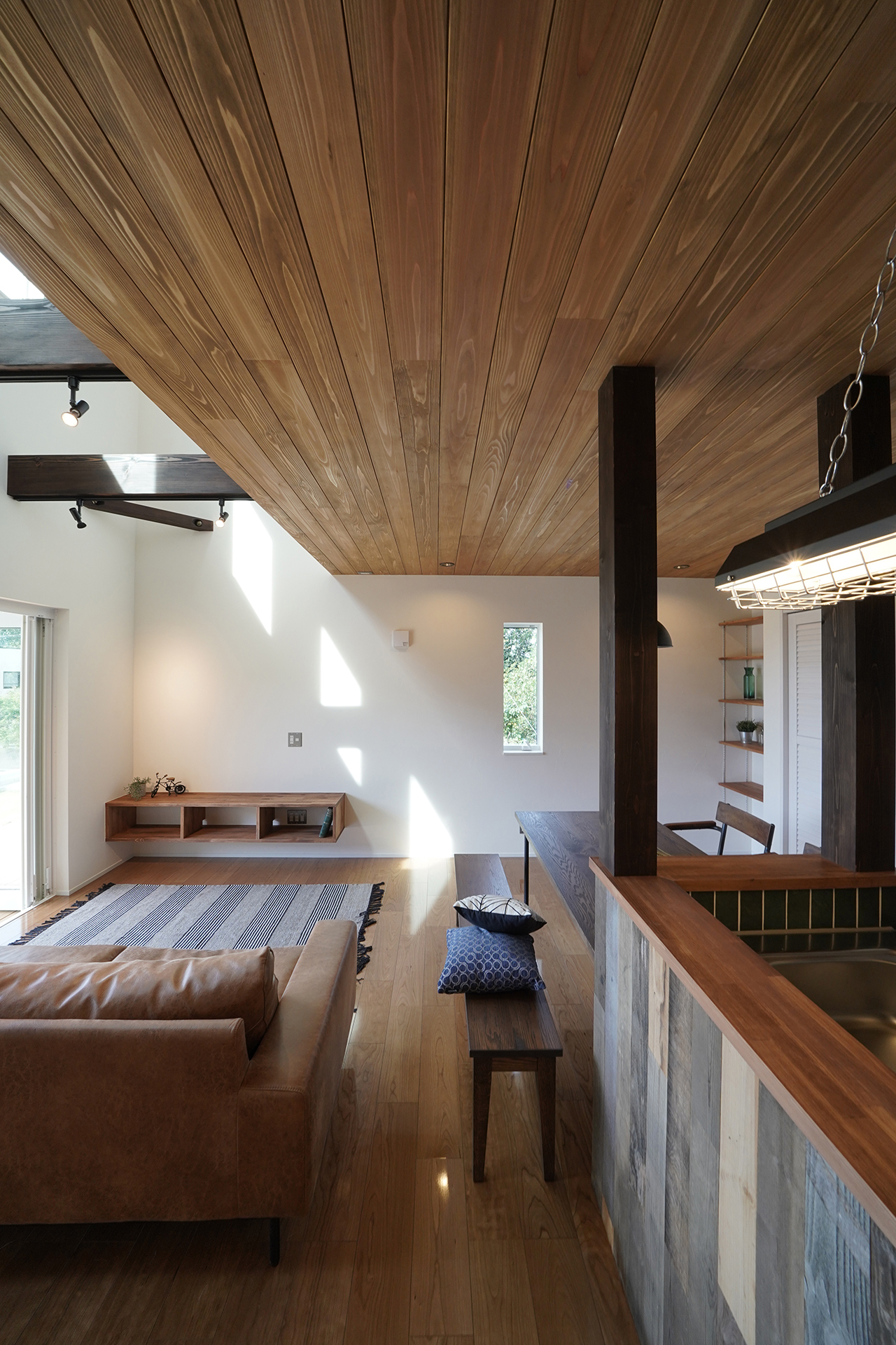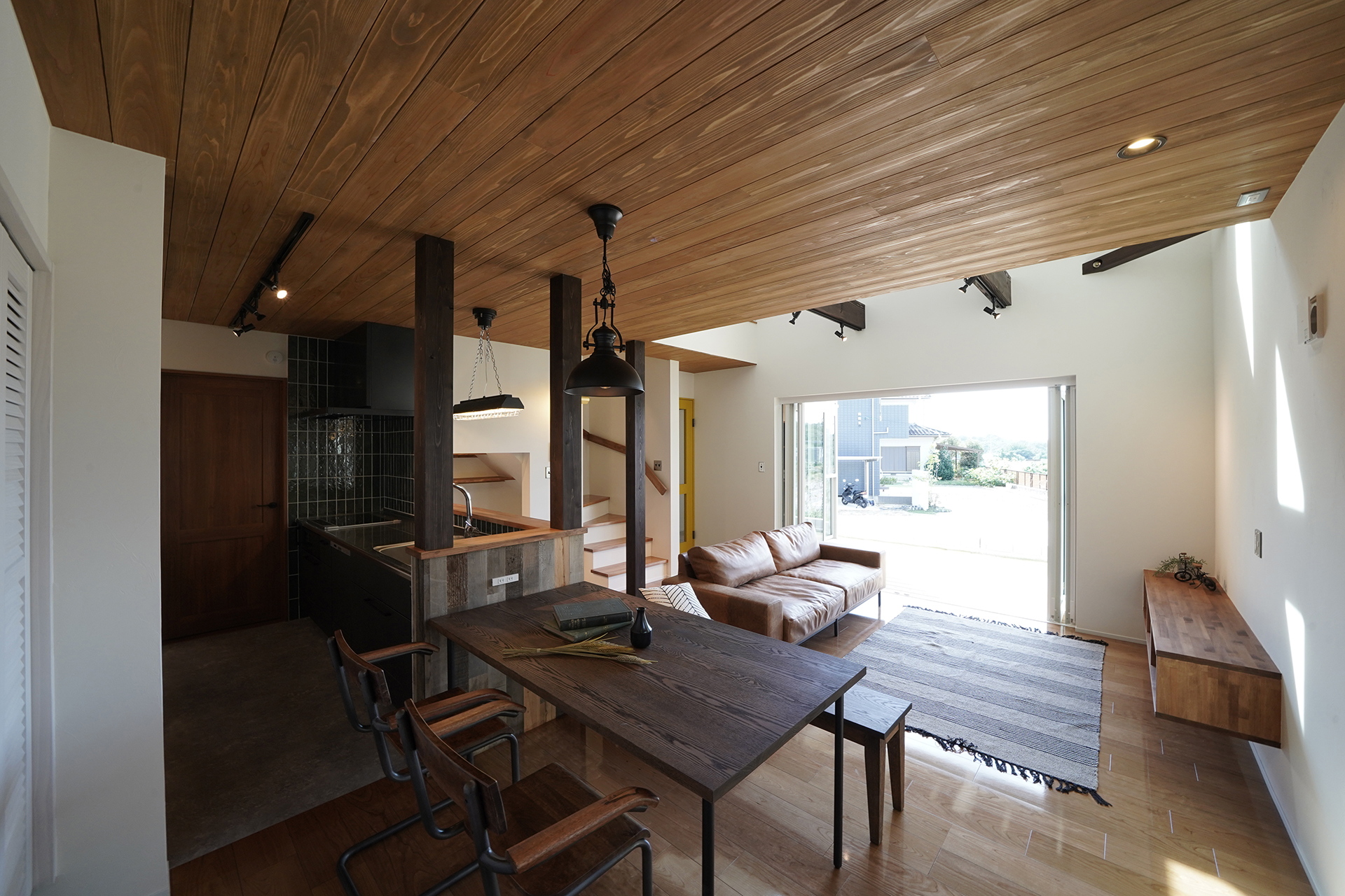 天井は針葉樹合板と梁表で木の部分を見せることで海外風の雰囲気に。