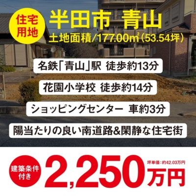 [no_toc] 物件情報 所在地 半田市青山4丁目12番6(マップ) 名鉄河和線 / 青山駅 徒歩13分 価格 2,250万円 お問い合わせ 下・・・