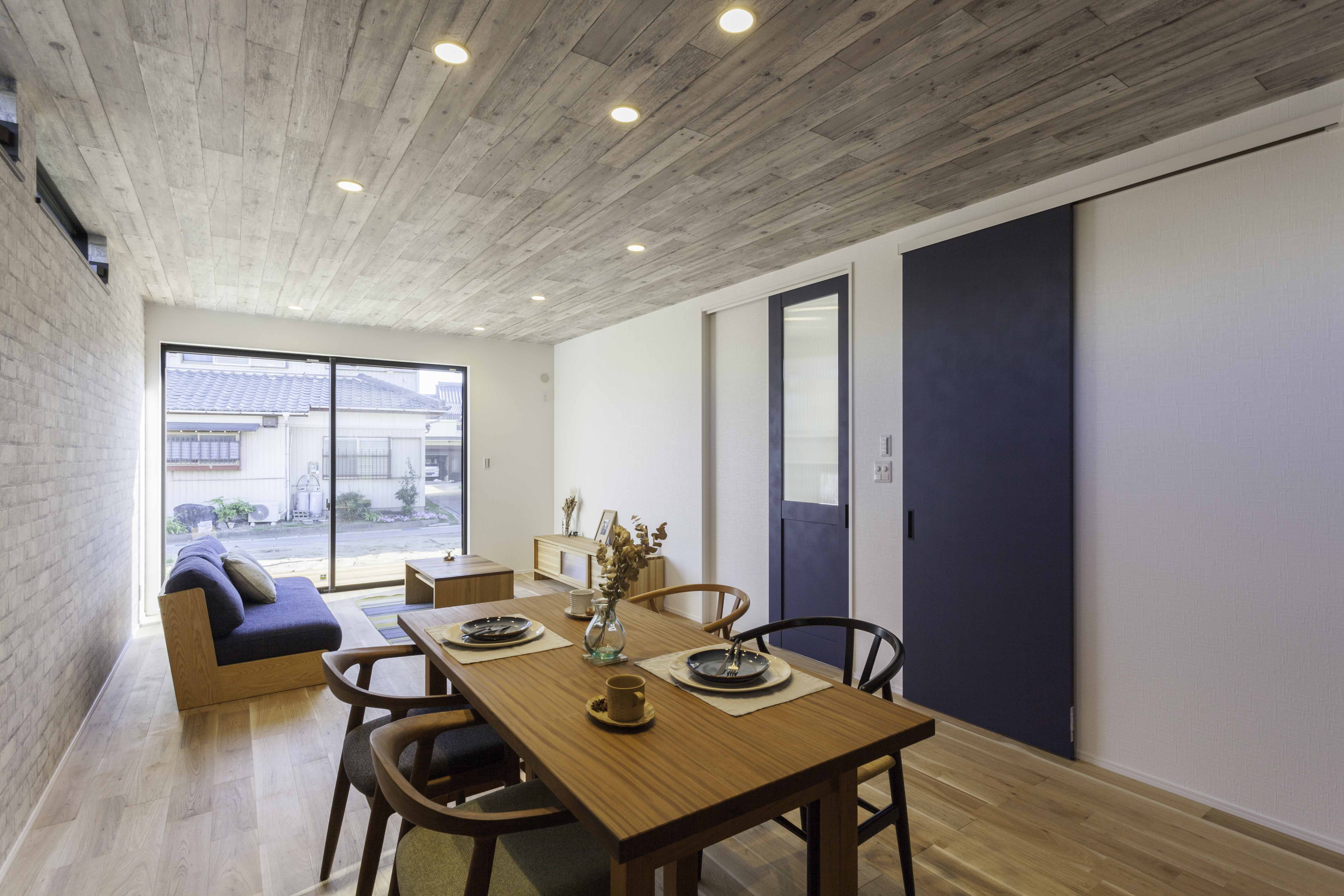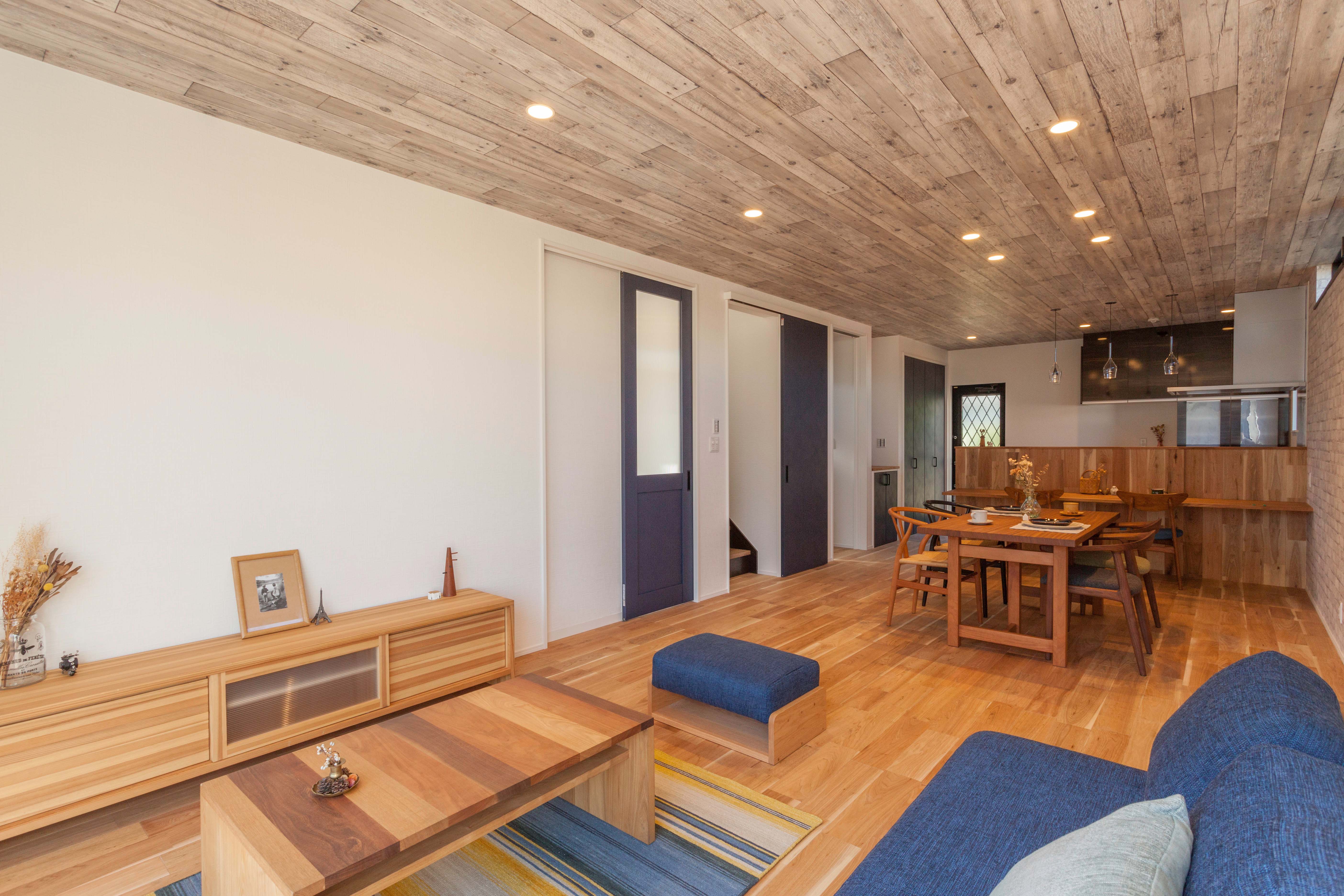 ネイビー色の建具を使い、くるみの床材と調和させています。