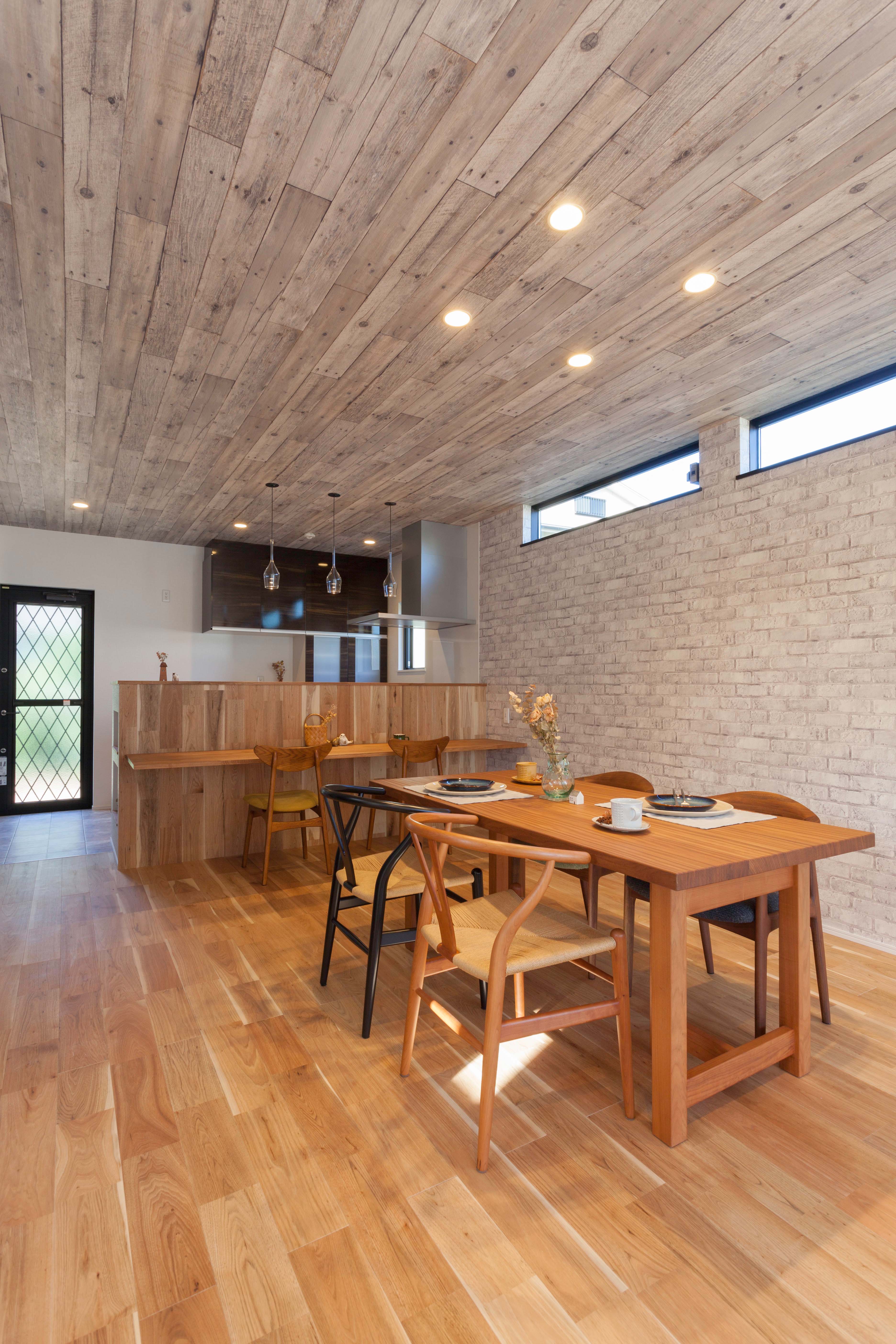 壁や天井には木目や、レンガ調の壁紙を選び、個性的な空間に。