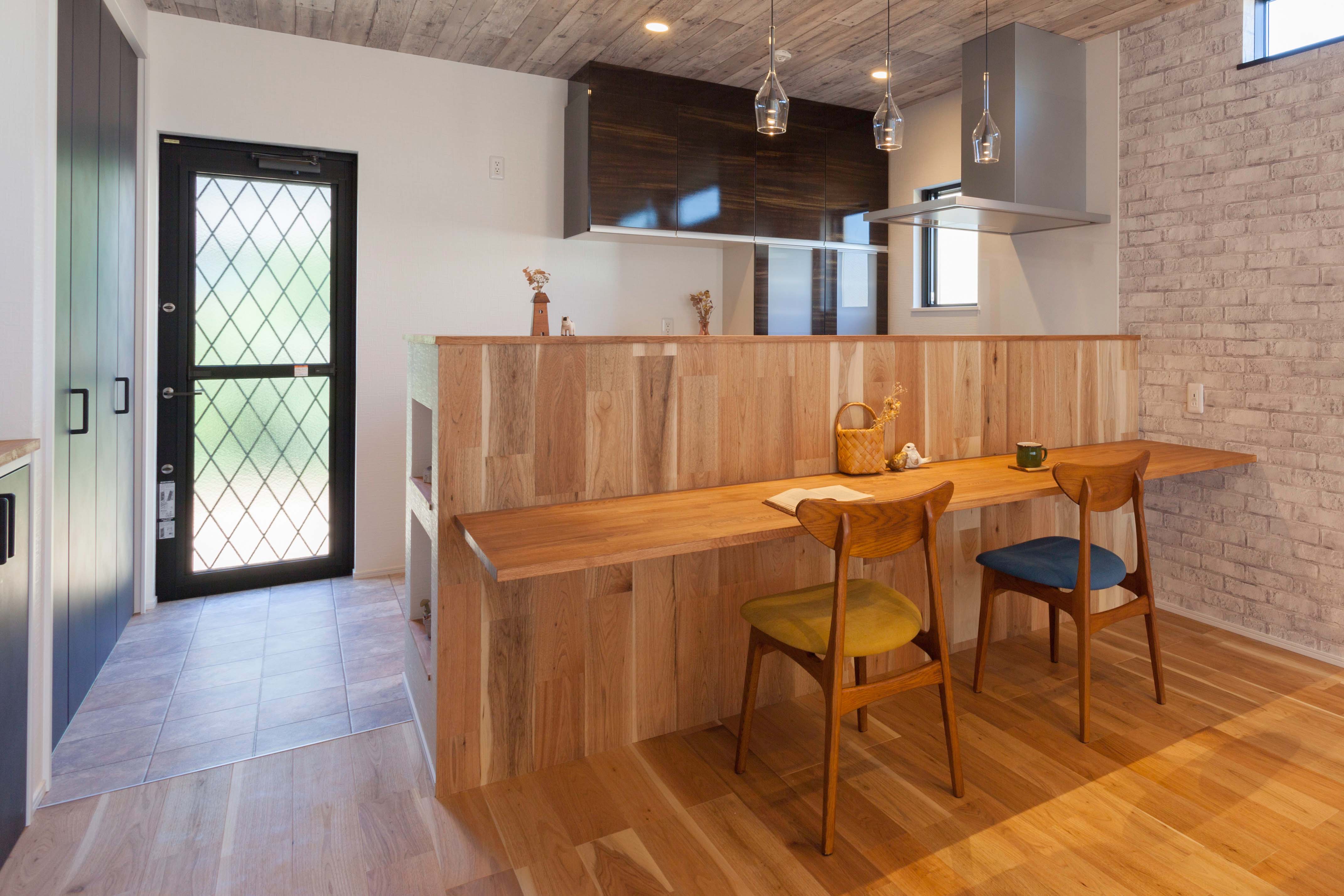 キッチン前の壁には床材と同じくるみの無垢材を貼り、表情の豊かなアクセントに仕上げました。
