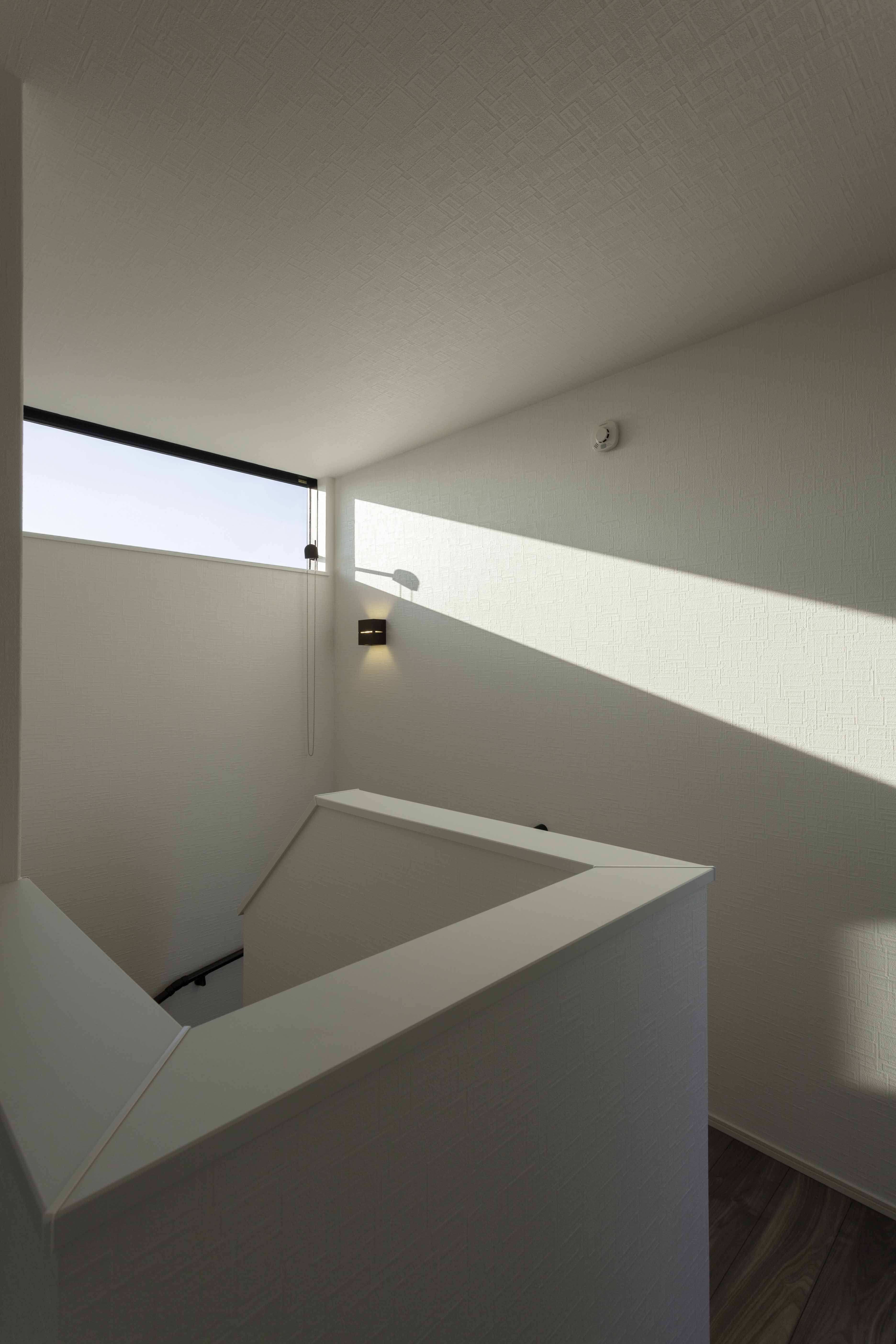 階段スペースは、天井とフラットのサッシが演出する光が魅力的。