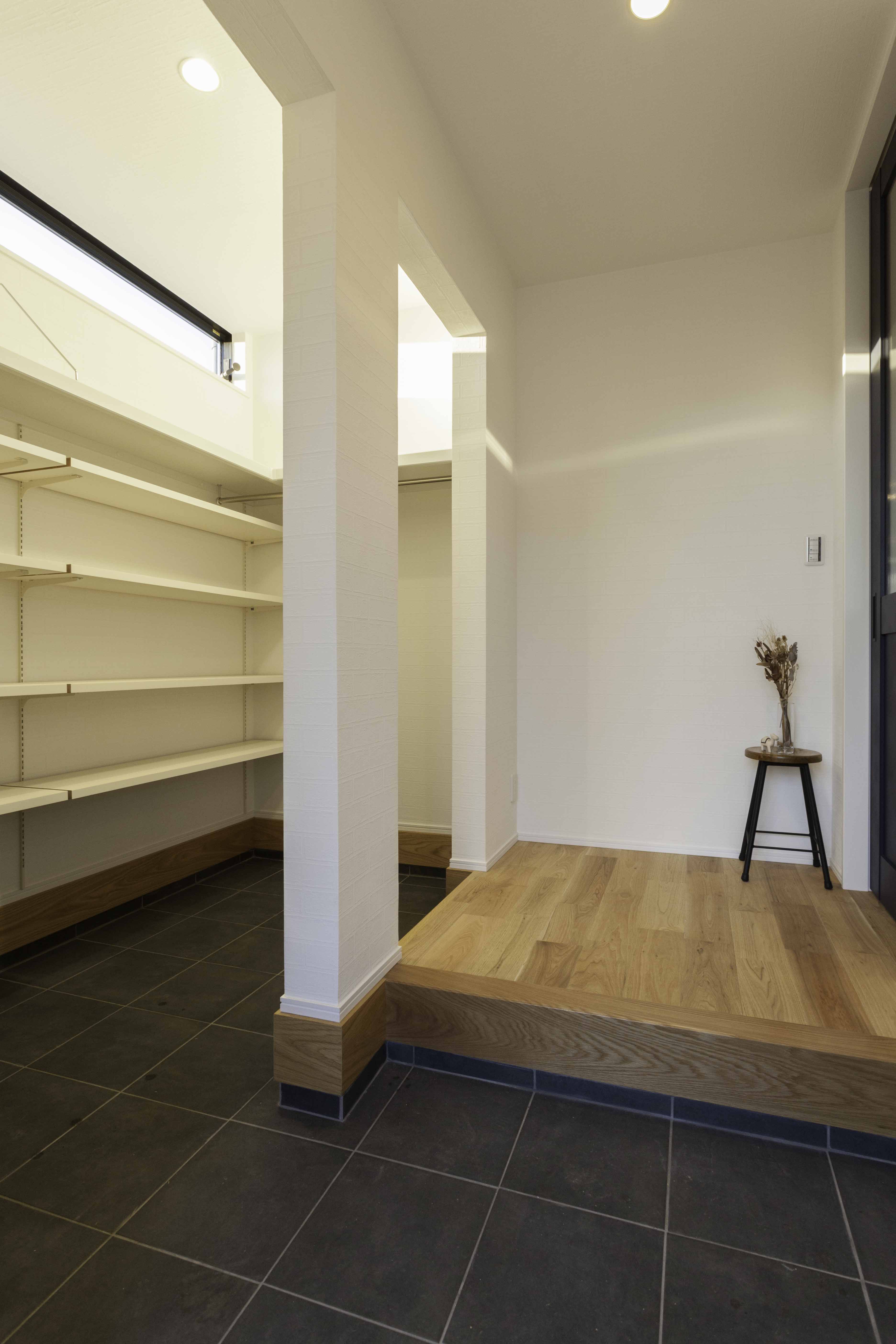 ベビーカーを畳まずに収納、雨の日のレインコートも部屋に持ち込まずに収納できる、シューズクローク。