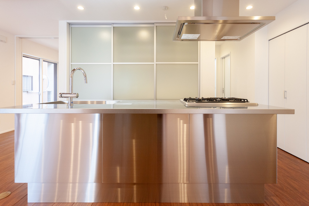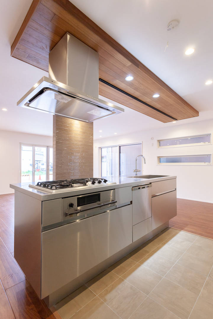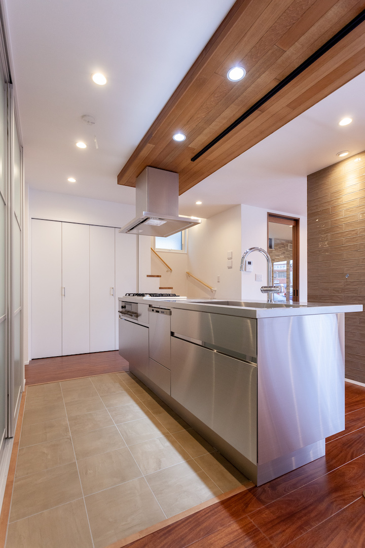 キッチンの床はリビングと貼り分け、タイルを使用しています。