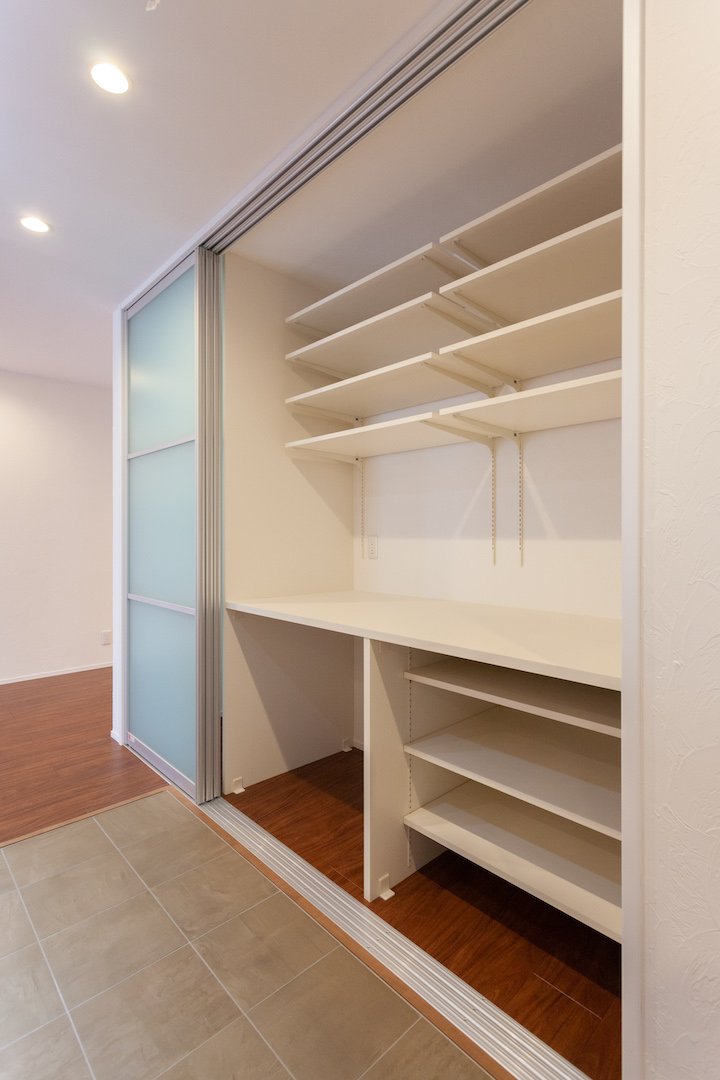 また、食器の大きさや量によって棚の位置を変えれるため、使い勝手が良いパントリーになっています。
