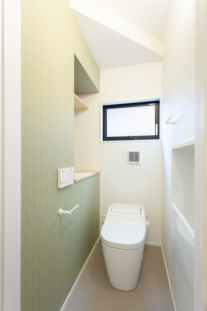 トイレの壁は1階と2階でアクセントの色を変えています。
