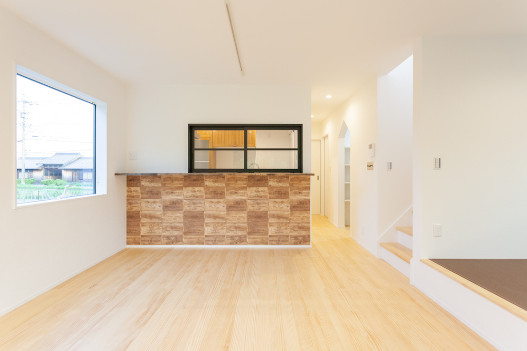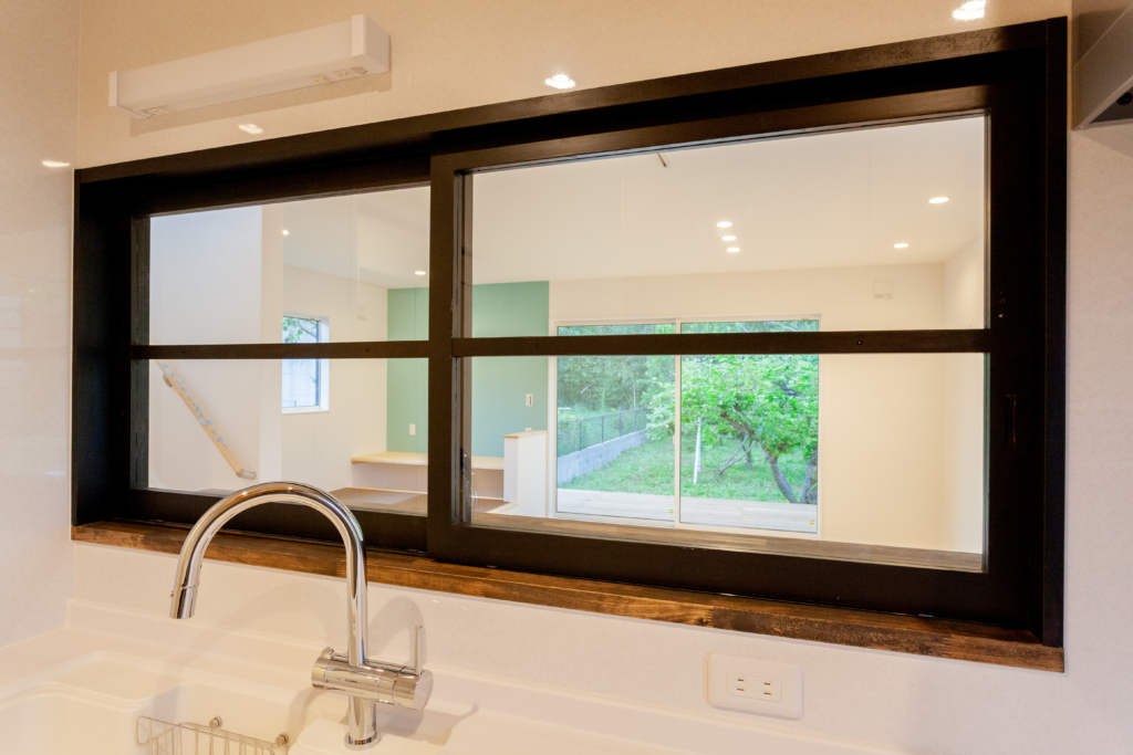 キッチンのシンク前には室内小窓をつけてあり、リビング・ダイニングの様子がしっかり確認できます。