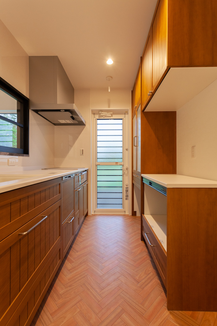 キッチン扉は無垢の木材を使用しており、床はヘリンボーンと呼ばれる模様を取り入れたおしゃれなキッチン空間。