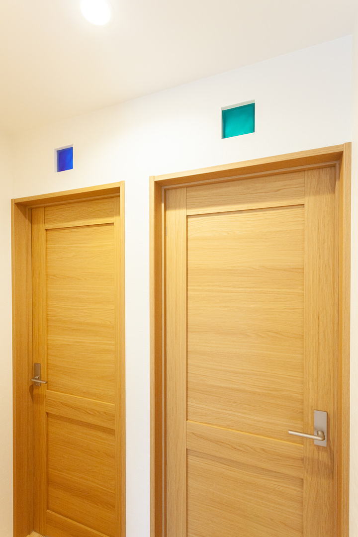 居室の入り口にはアクセントにガラスのカラーブロックを埋め込んでいます。