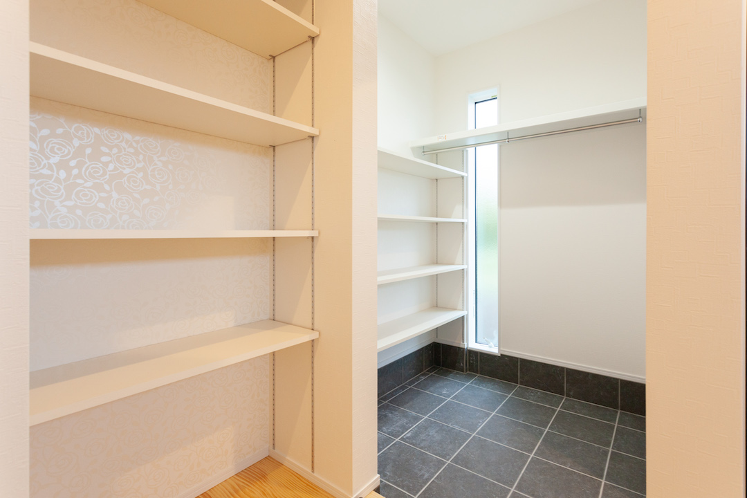 土間続きの収納スペース。こちらにも窓があり、換気も可能です。