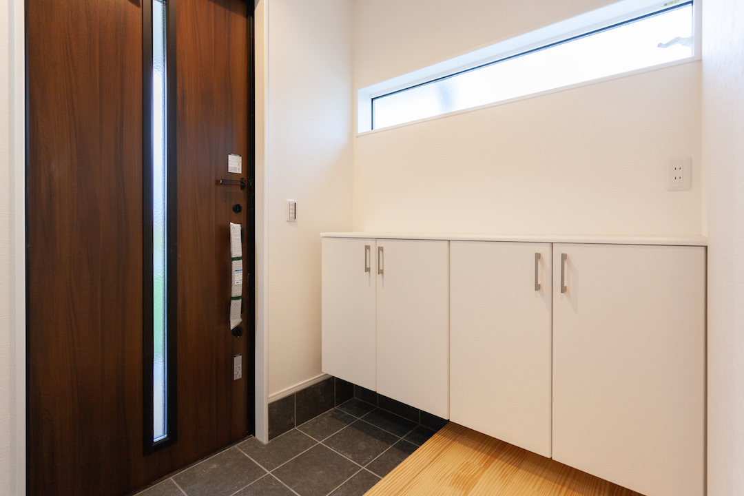 暗くなりがちな玄関スペースには、大胆に窓を設けて明かりを取り込みました。