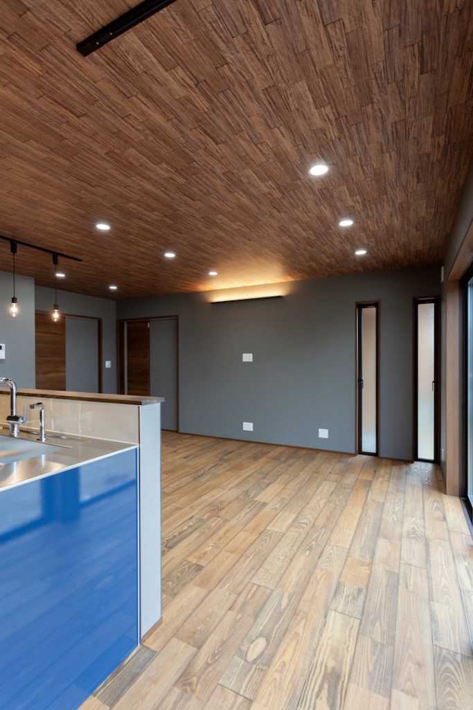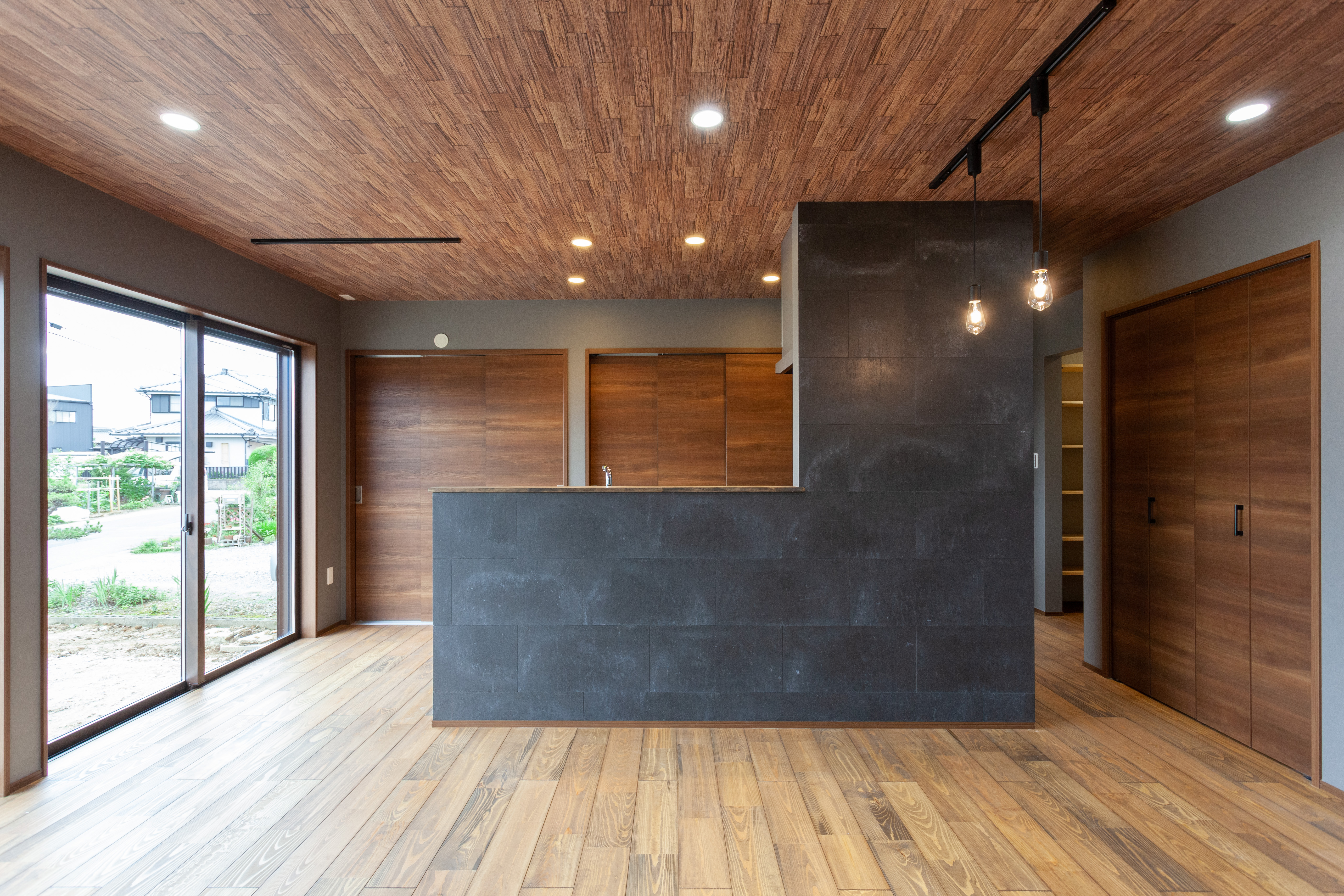 落ち着いた色合いのLDK。対面式キッチンの正面にはケイミュー社製の壁材「ソリッド」を貼り付け。