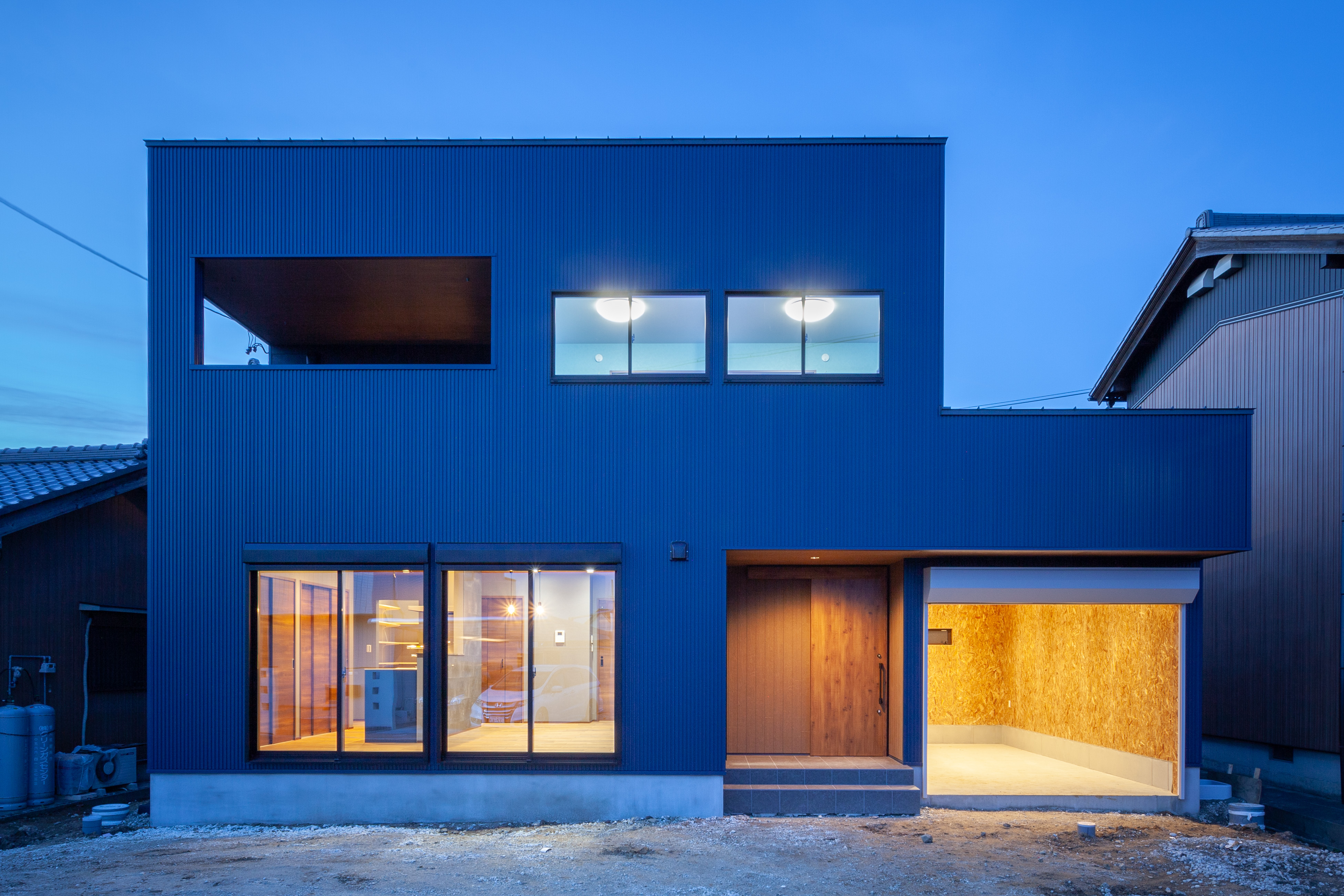 外壁には、ネイビーのガルバリウム鋼板と玄関に「光セラ」サイディング、