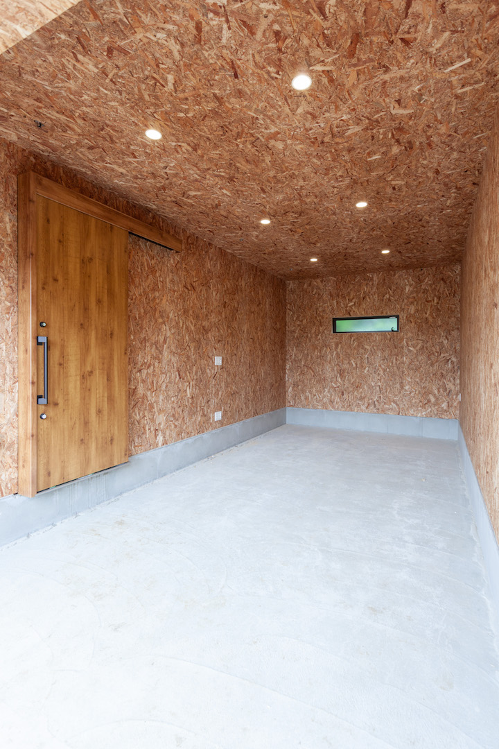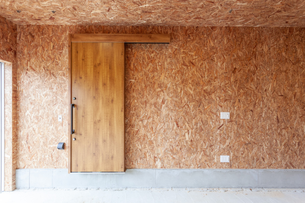 インナーガレージは、壁にはOSB(薄い木材チップを接着剤とともに圧着した板)を貼り付けし、床はコンクリートをラフさを残した仕上がりとして、作業スペースのような良い意味で気を使わなくていい空間にしました。