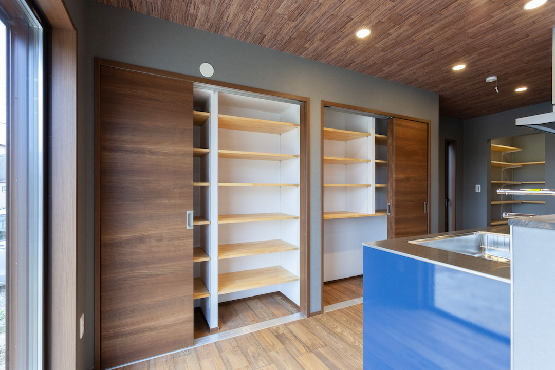 キッチンの横にひっそりと設けられてパントリーは人目につきにくいので建具は付けずに使い勝手を優先しました。