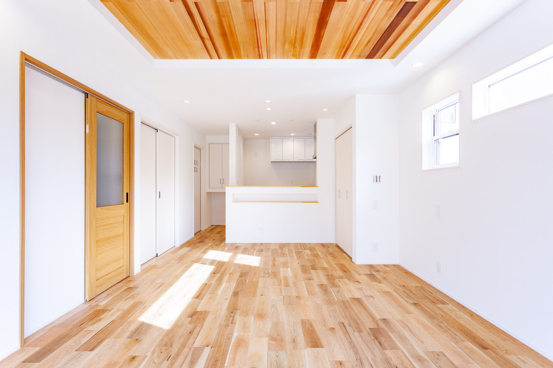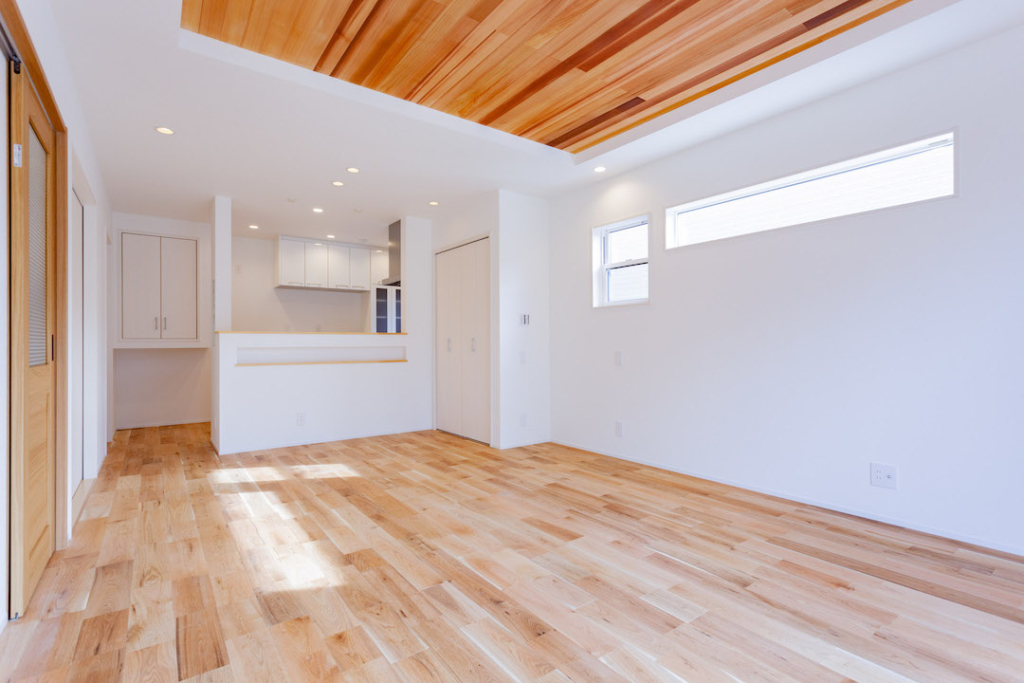 リビングスペースの天井は一段高くして暖かな色味のレッドシダーを貼りました。