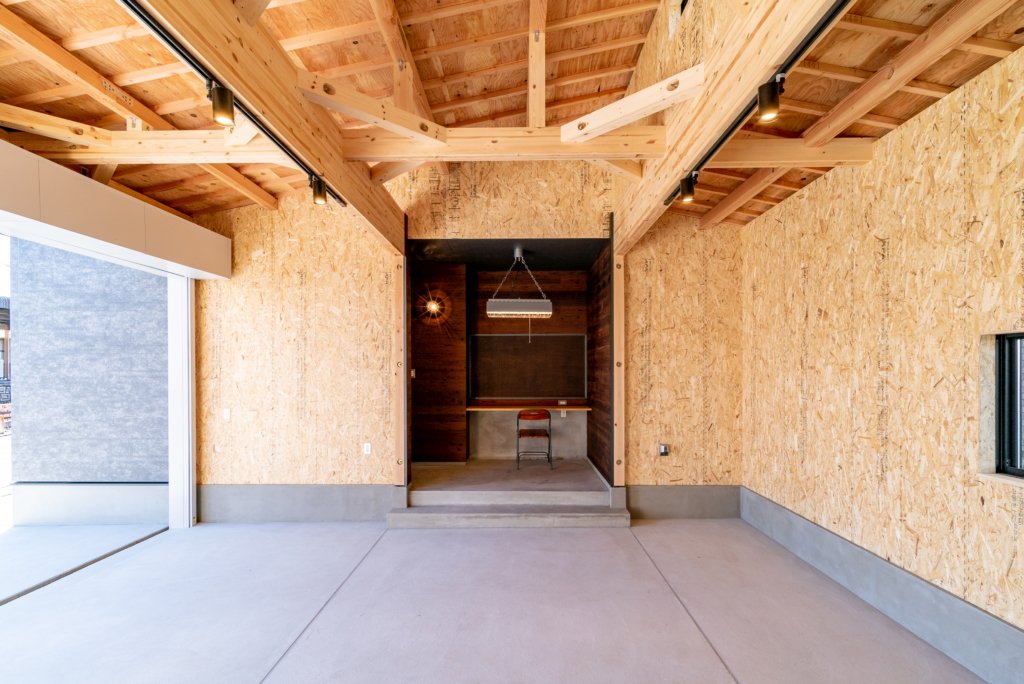 インナーガレージの天井には何も貼らずに構造材をあらわしに