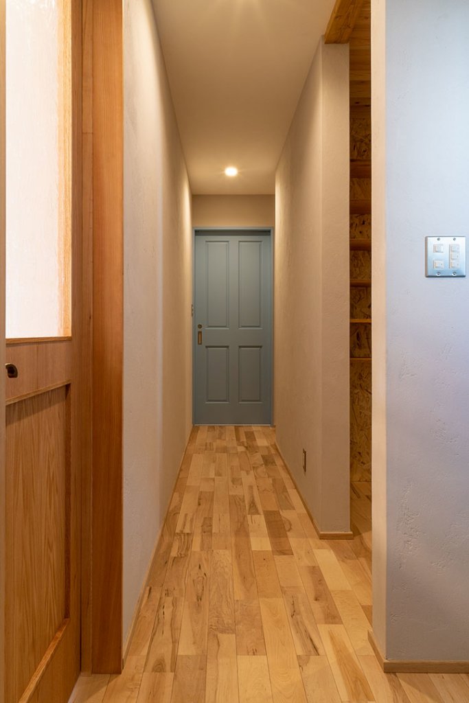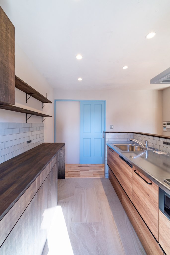 白を基調とした空間の中にライトブルーのドアがアクセントに。