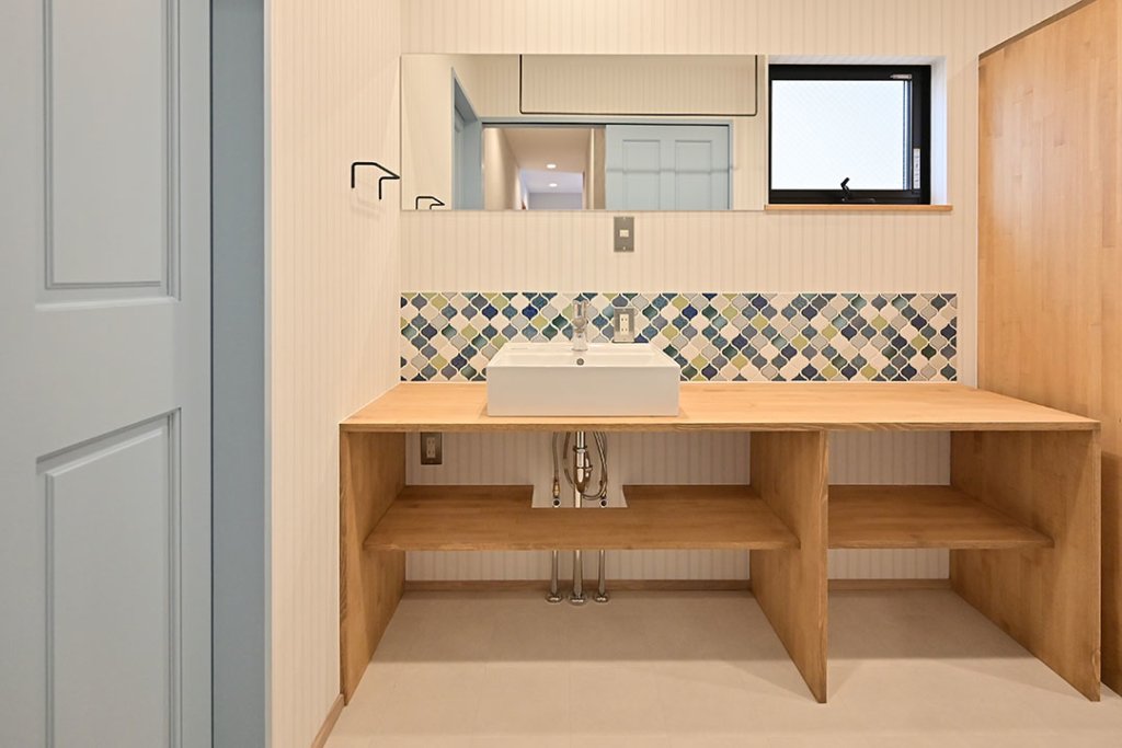 清潔感溢れる色合いでまとめた洗面化粧台。