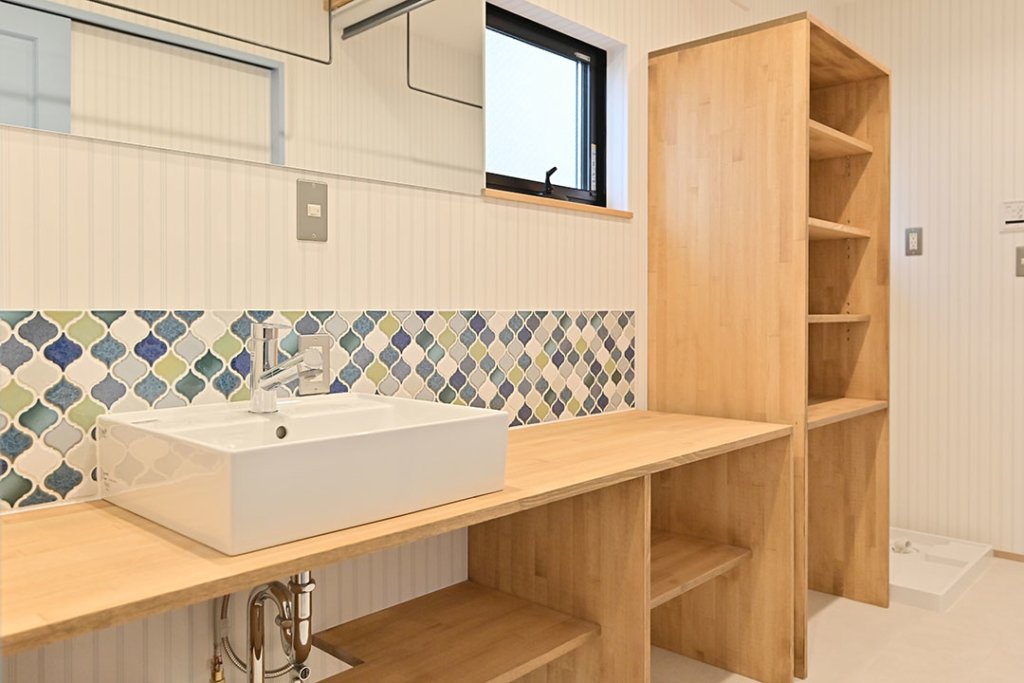 奥には棚を設け、バスタオルやランドリー用品をすっきりと収納できるスペースに。