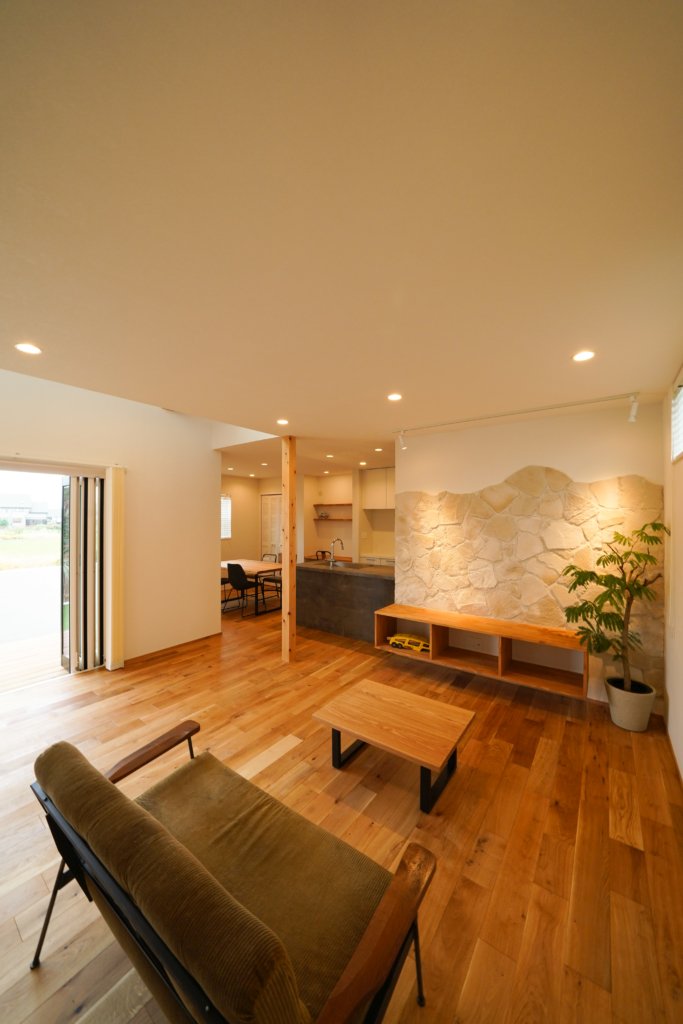 造作のTVボードの背面には本物の石を貼っています。
