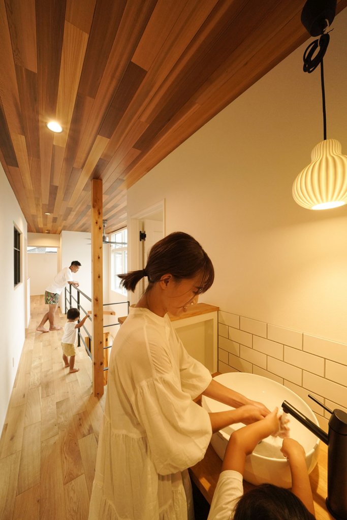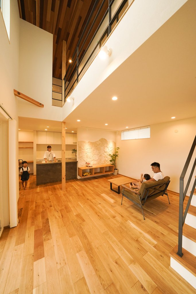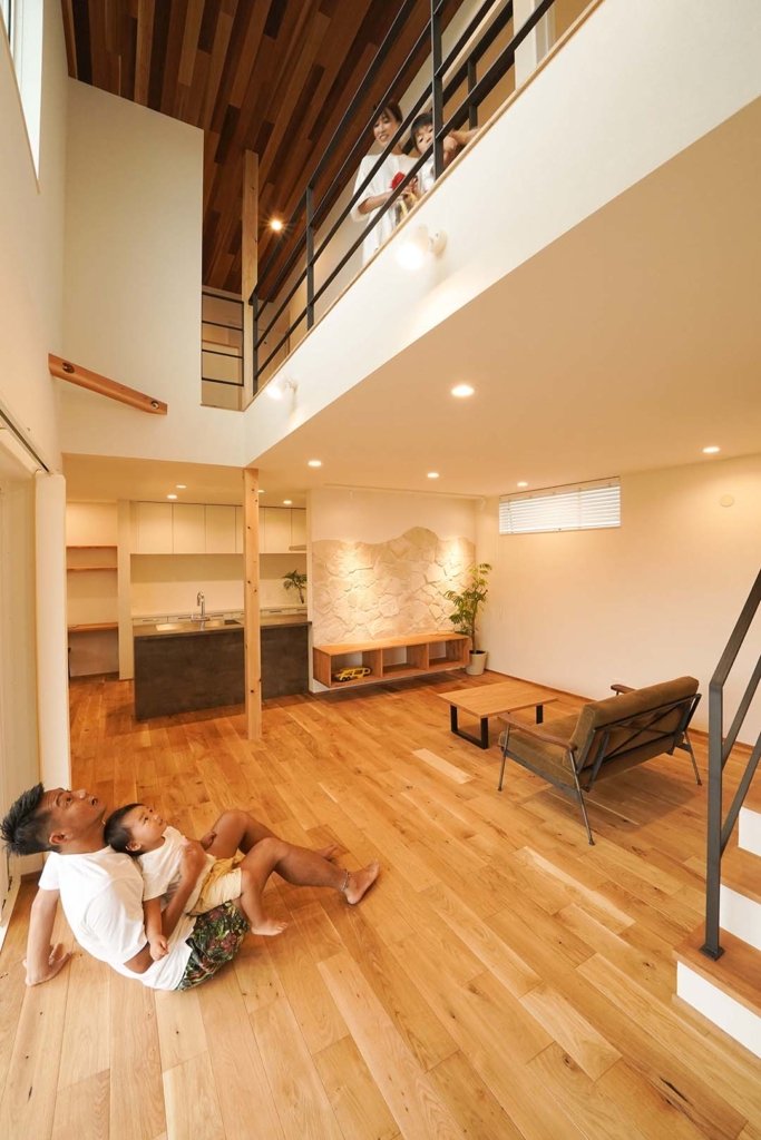 それぞれ違う階にいても、大きな吹き抜けがあれば家族のつながりを感じられます。