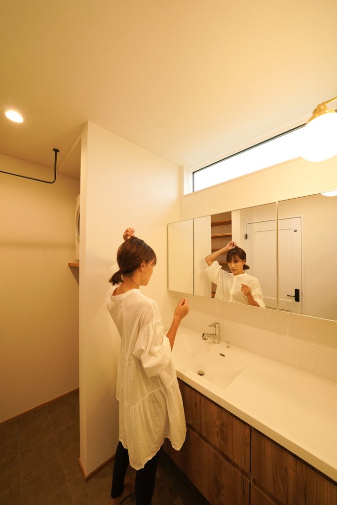 ヘリンボーン柄にタイルを施工。洗面スペースが広いので、混み合う朝も安心。