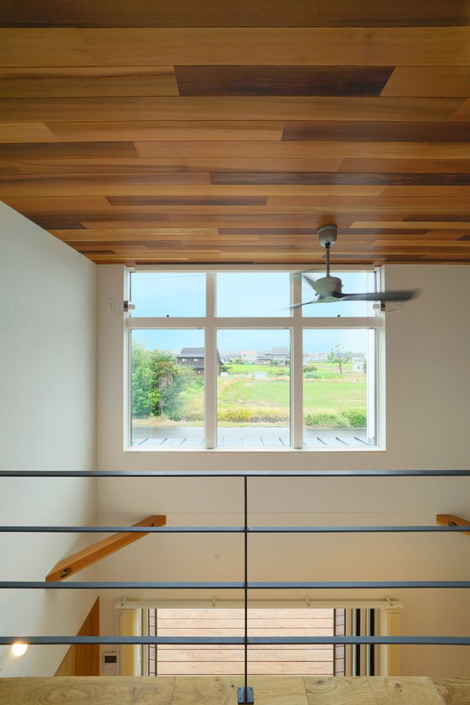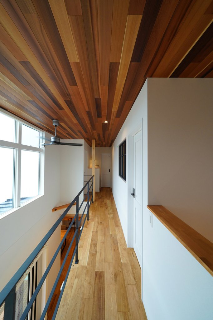 レッドシダーの天井が間近に迫る、2階の廊下。真横の窓からは太陽の光が差し込み、