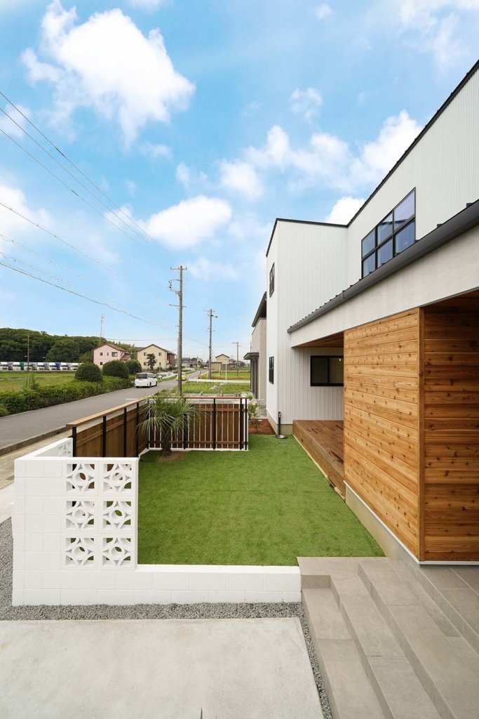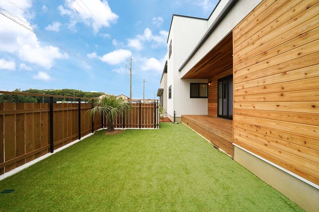 人工芝のある中庭。天然芝よりも耐久性が高く、敷いた後のメンテナンスは不要。