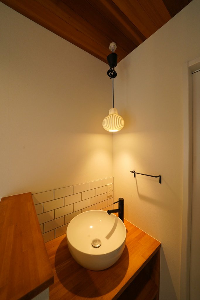 2Fトイレの前に設置された手洗いボウル。ここにもキッチンと同じ白のサブウェイタイルを施工しました。