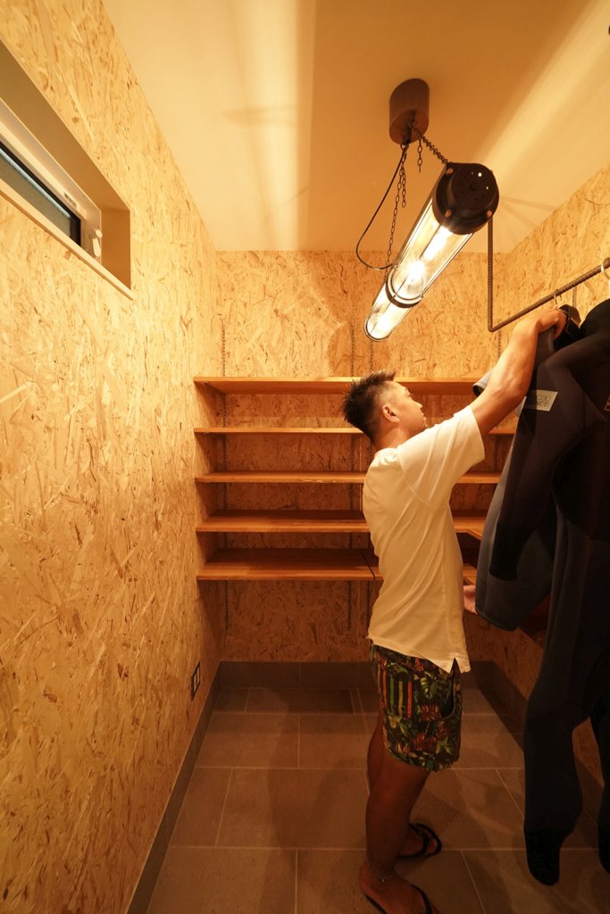 お施主様の趣味であるサーフィン道具や、お外で使うお子様の遊び道具も屋内へ収納できます。