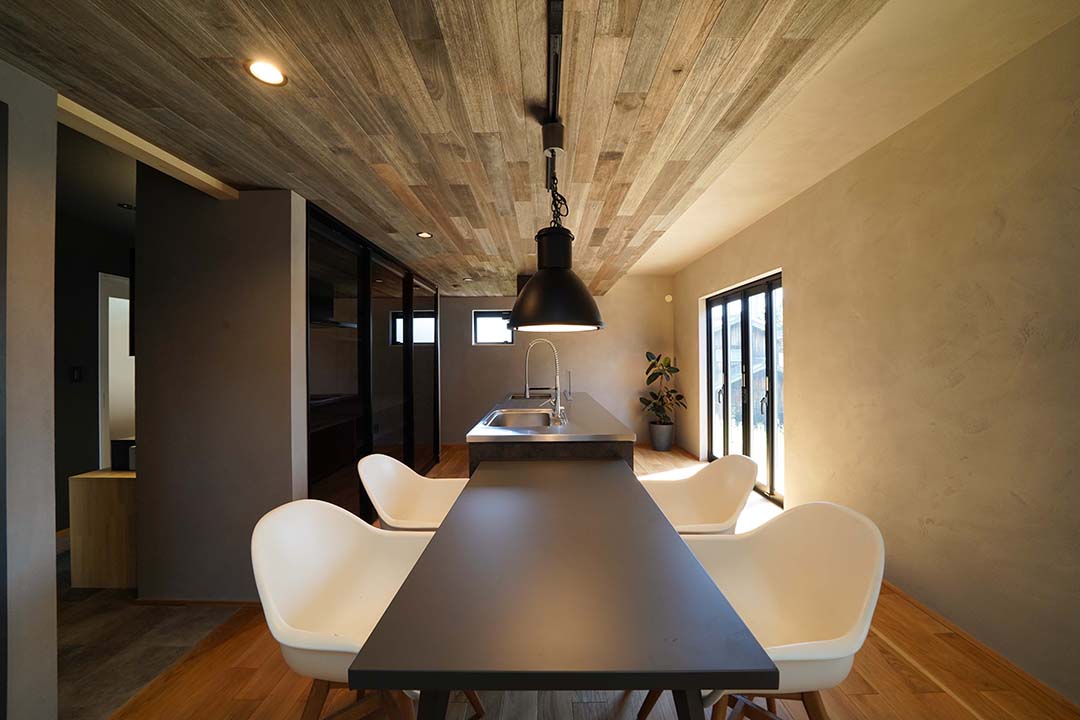 インダストリアルなイメージの照明とコーディネートされたダイニング。