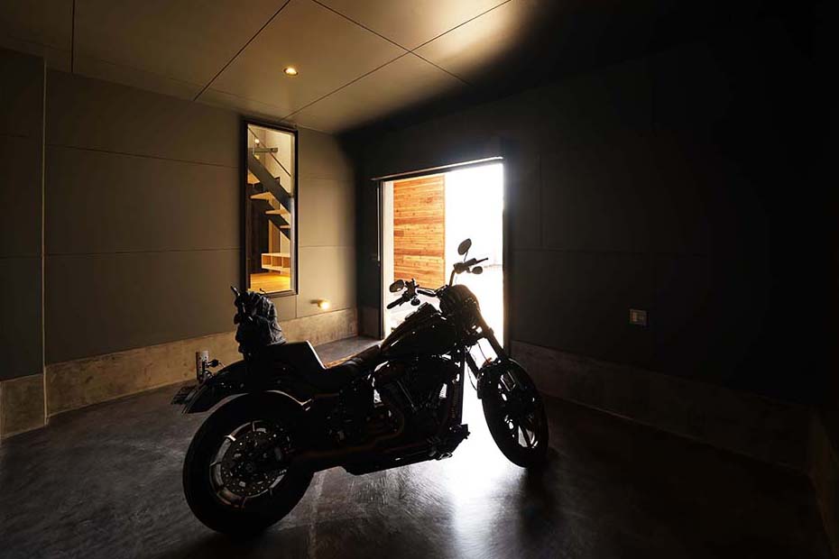 バイクを引き立てるライティングもできる、広々としたインナーガレージ。